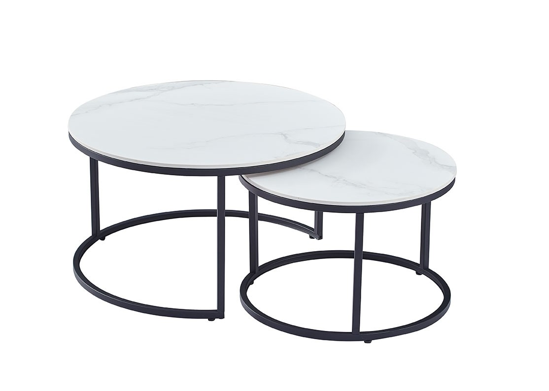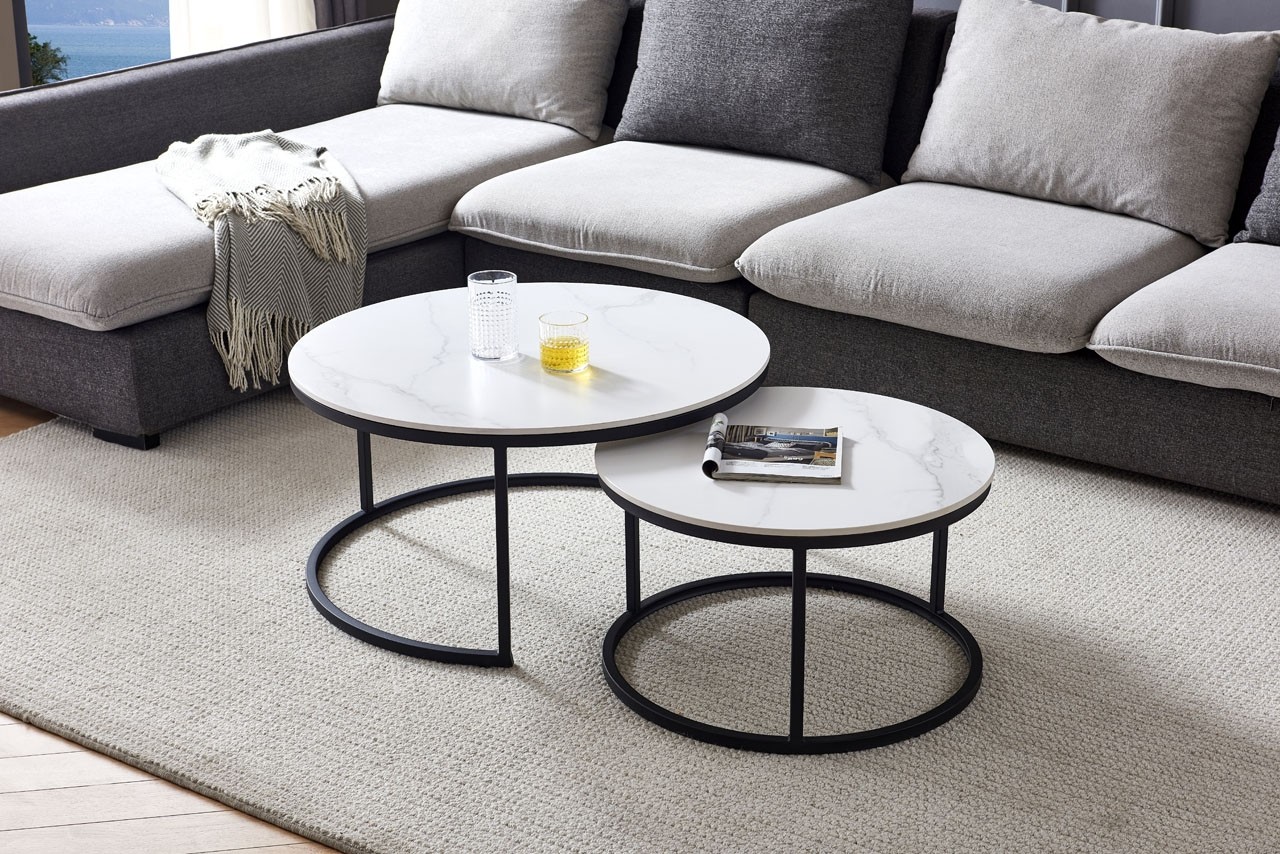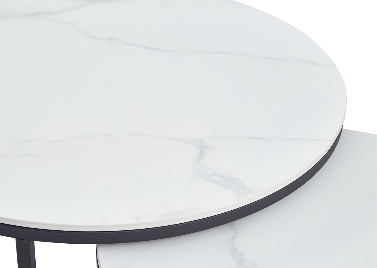 Set od dva okrugla bijela klub stolića modernog je izgleda, a prikladan je i za najmanji studio. Obje ploče stola izrađene su od sinteriranog materijala s uzorkom od bijelog mramora. Ovaj stol idealan je za osobe s malom djecom jer se teško lomi i otporan je na toplinu i hladnoću. Stolovi pristaju tako da se manji može preklopiti ispod većeg i tako ne zauzimaju dodatni prostor ako ga nemate na raspolaganju tijekom dana. Stol je izrađen od kvalitetnih materijala kao i noseća ploča koja je izrađena od MDF materijala. Ima noge od metala, koje su lakirane zbog manjeg trošenja. Stol ima nosivost 120 kg.