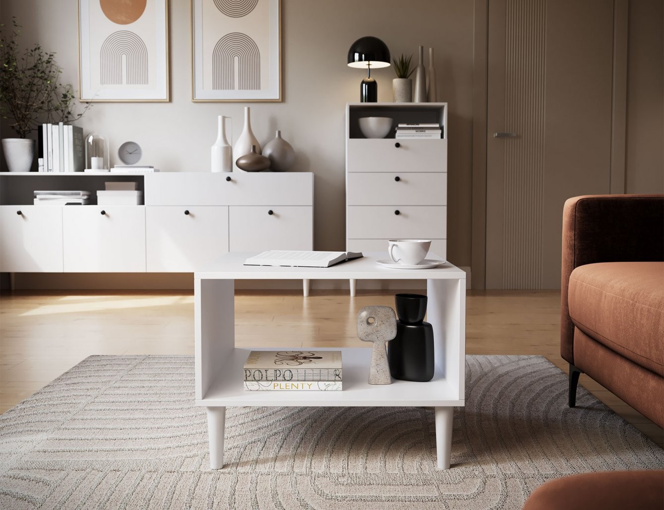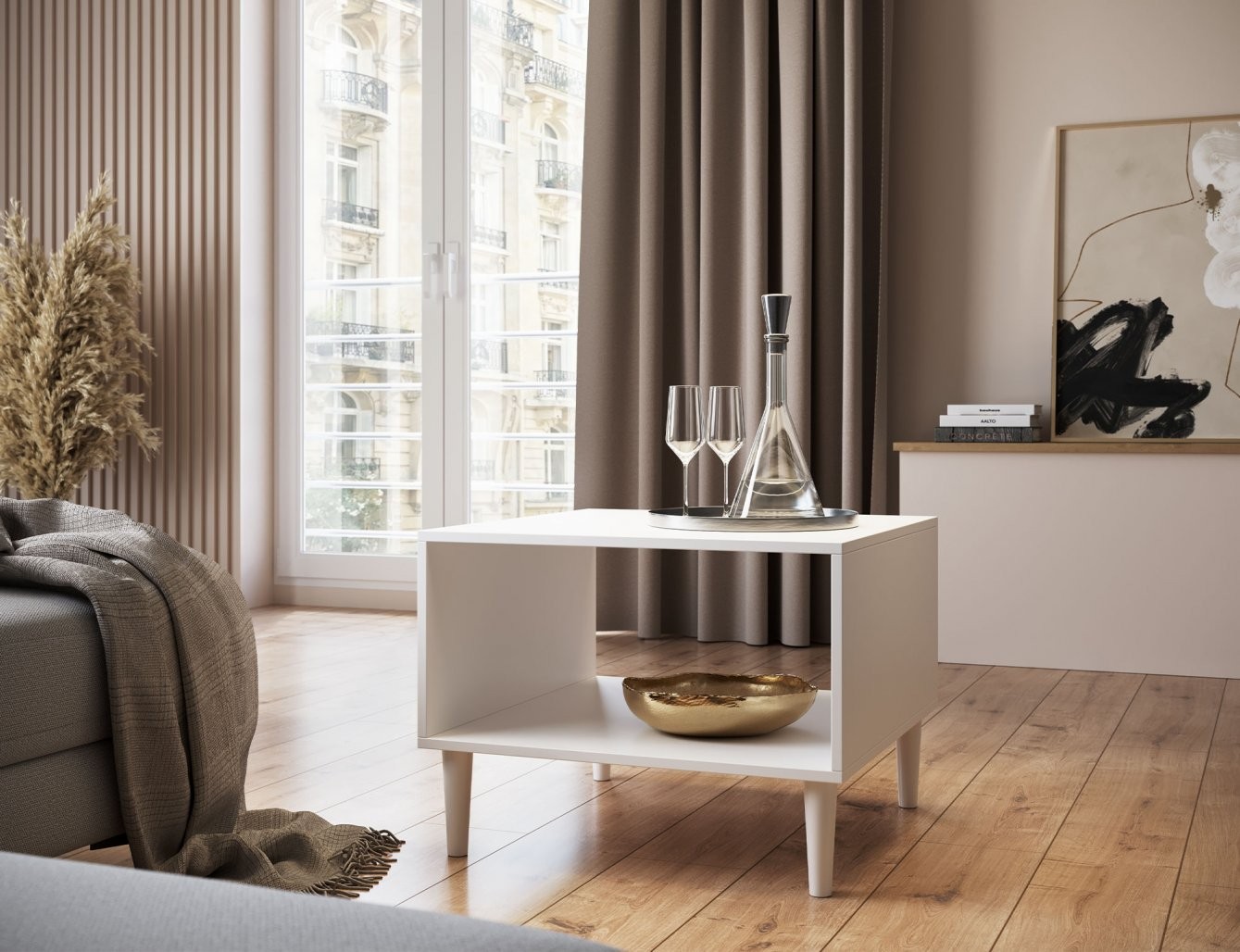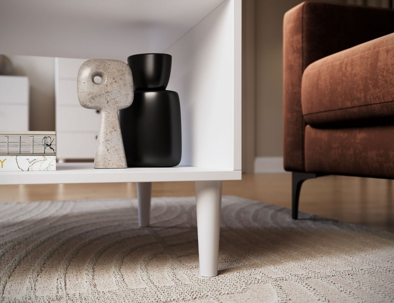 Ovaj stolić stoji na čvrstim drvenim nogama, visokim 15 cm, što mu daje lagan i stilski izgled. Kombinacija kvalitetnih materijala i promišljenog dizajna osigurava dugotrajnu upotrebu i stabilnost. Idealan je izbor za dnevne sobe gdje vam je potrebna funkcionalna površina koja ne zauzima previše prostora.