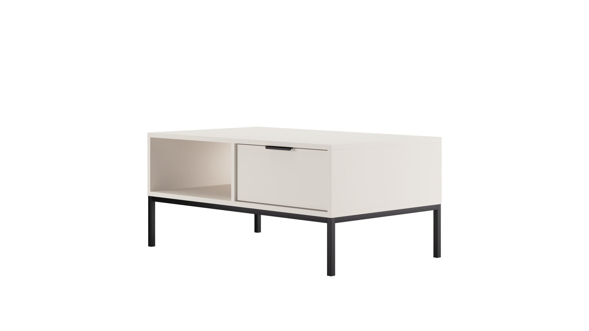 Minimalistički oblik omogućuje da se stolić lijepo uklopi i u suvremeno i u klasičnije uređene prostore. Osim gornje površine uključuje otvorenu policu na lijevoj strani i dvije prostrane ladice na desnoj, pa je prikladan za pohranu sitnih predmeta, časopisa i dodataka. Aluminijske ručkice, čelične noge s praškastim premazom i ABS rubovi nadopunjuju funkcionalan dizajn, a ladice imaju puni izvlačaj na sinkroniziranim vodilicama.