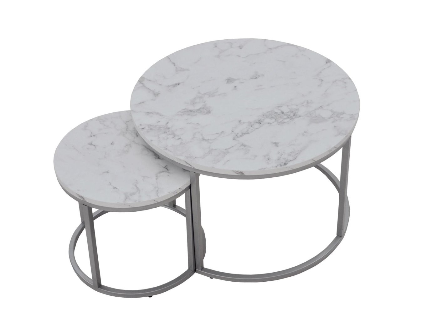 Klub stolić Anel s daškom klasičnog prestiža. Dva stolića s mramornom površinom i srebrnim nogama od praškasto lakiranog čelika koji stvaraju profinjen i elegantan izgled.