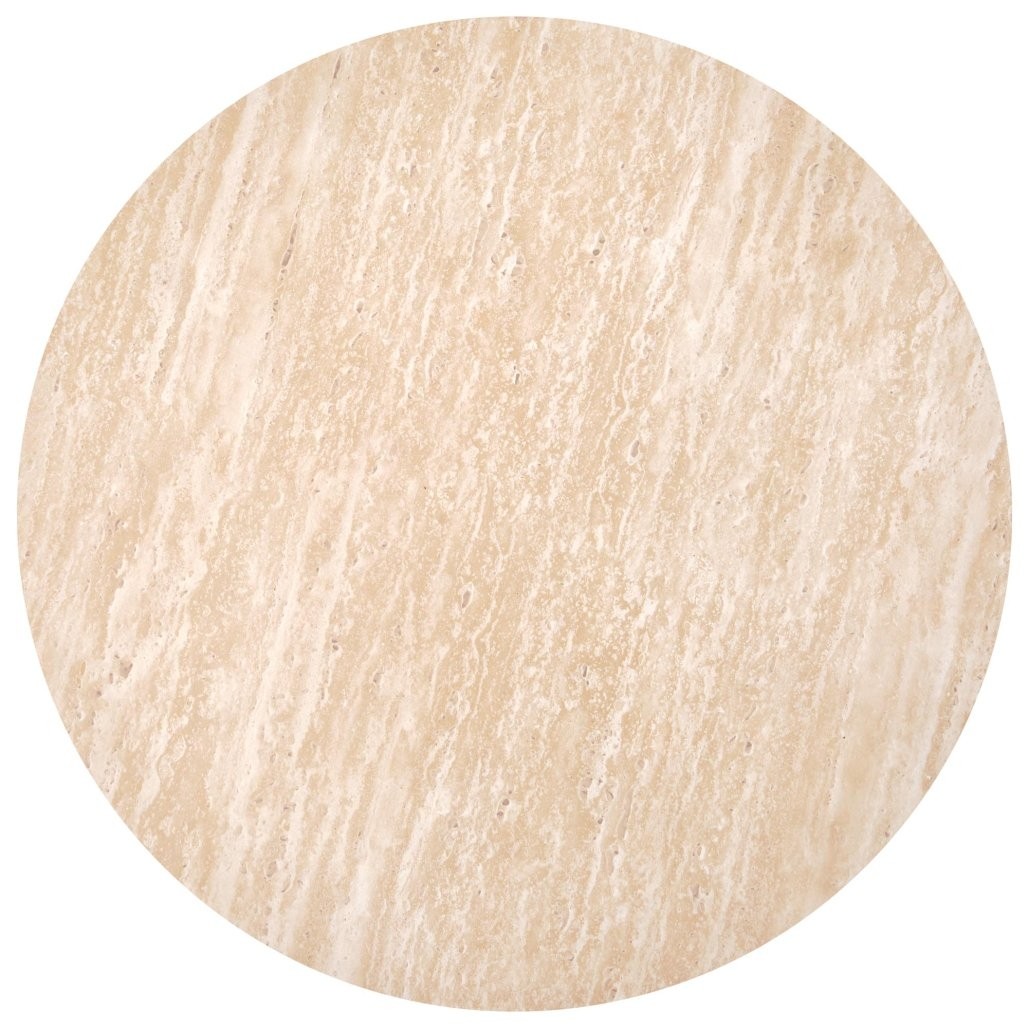 Klub stolić Arlan od laminiranog MDF-a u nijansi travertina, okruglog oblika s niskim profilom. Stilski dodatak za suvremene interijere.