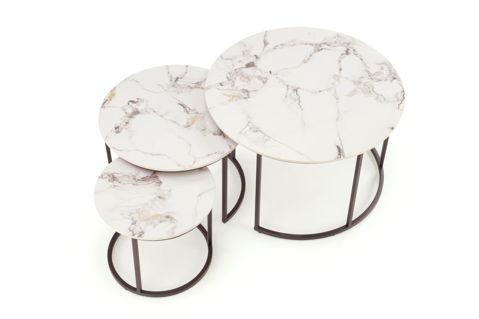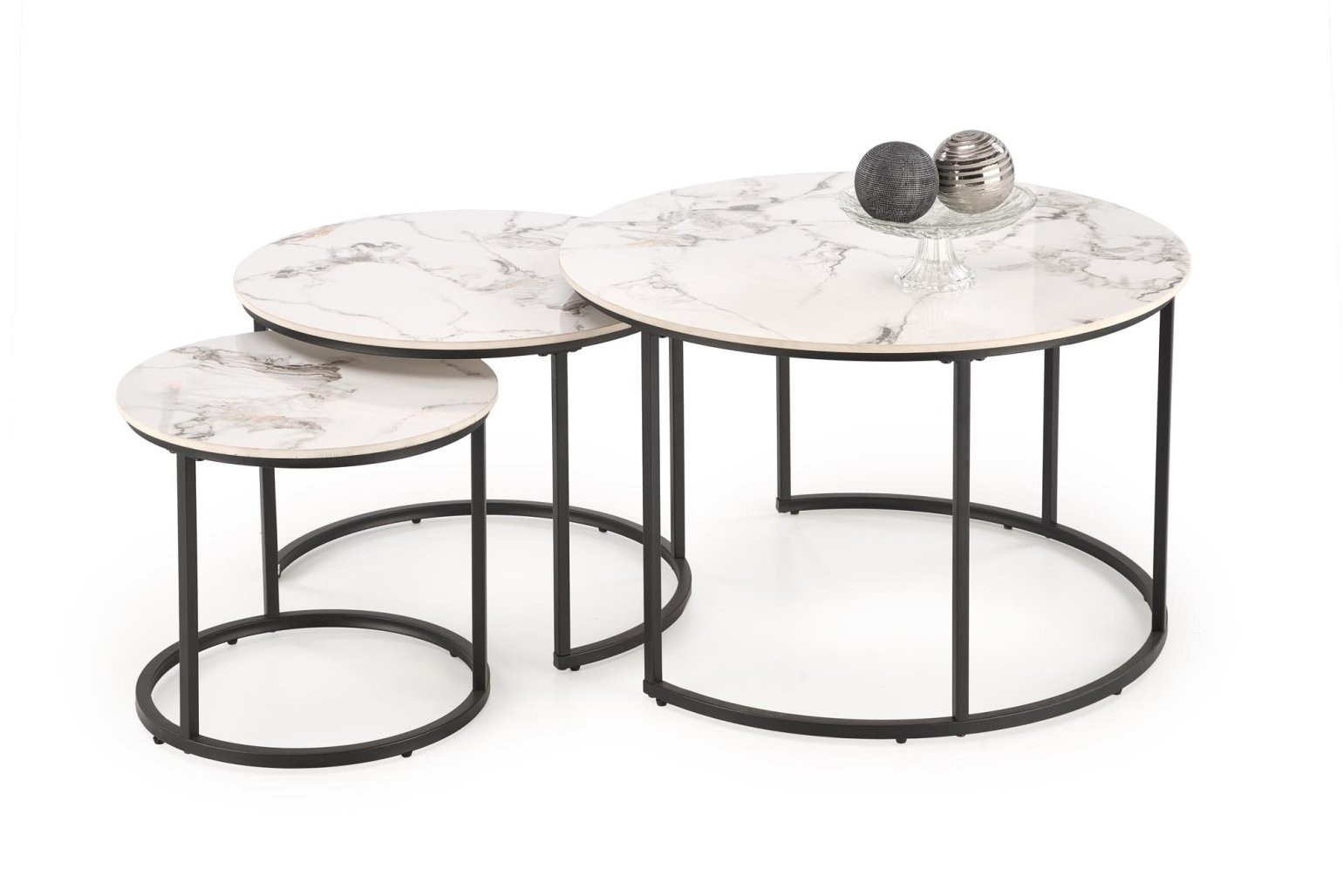 Set od tri klupska stolića Barel sa sintranom površinom i crnim okvirom. Prefinjen i elegantan dodatak za dnevne sobe u suvremenom ili klasičnom stilu.