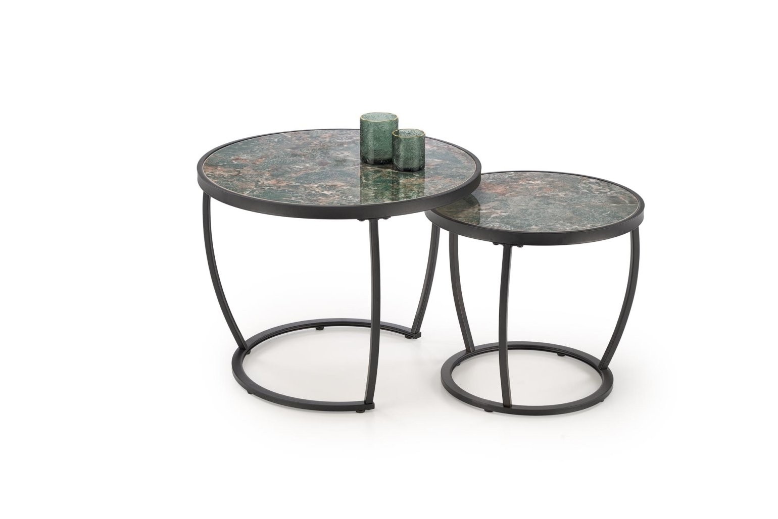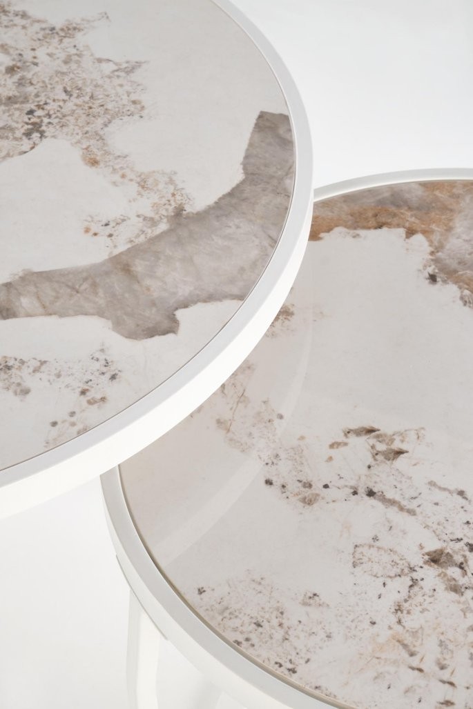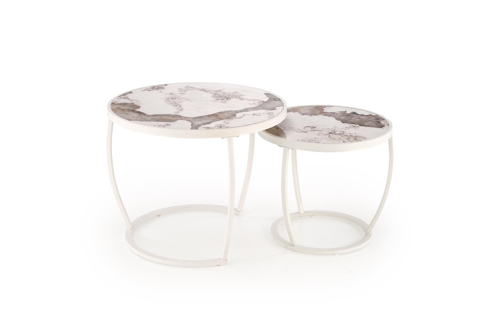Klub stolovi Elaris su set od dva stola koji kombiniraju bež mramor i bijeli metal. Kao moderan dodatak, ovaj set stolova osvježit će svaki prostor modernim dodirom.