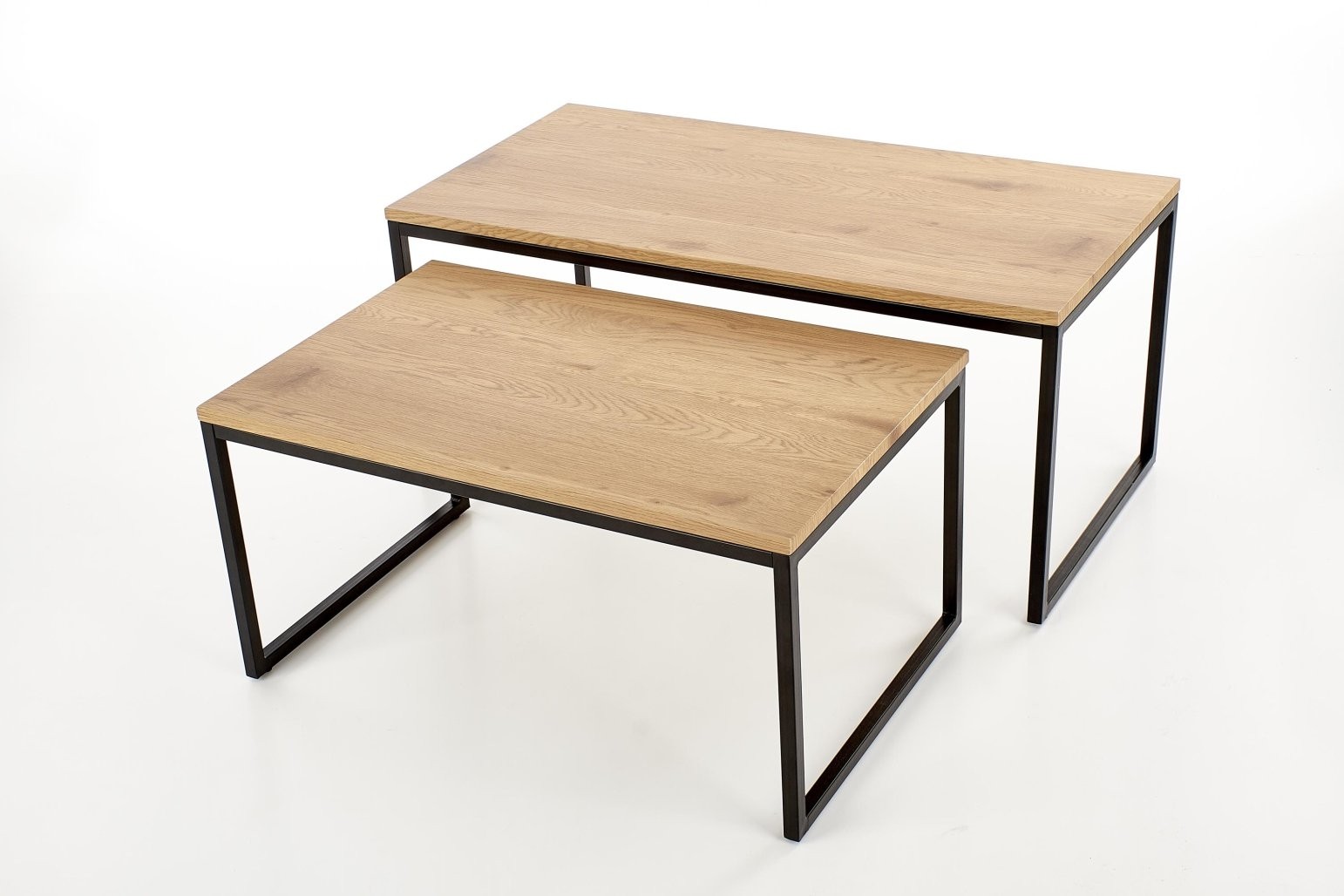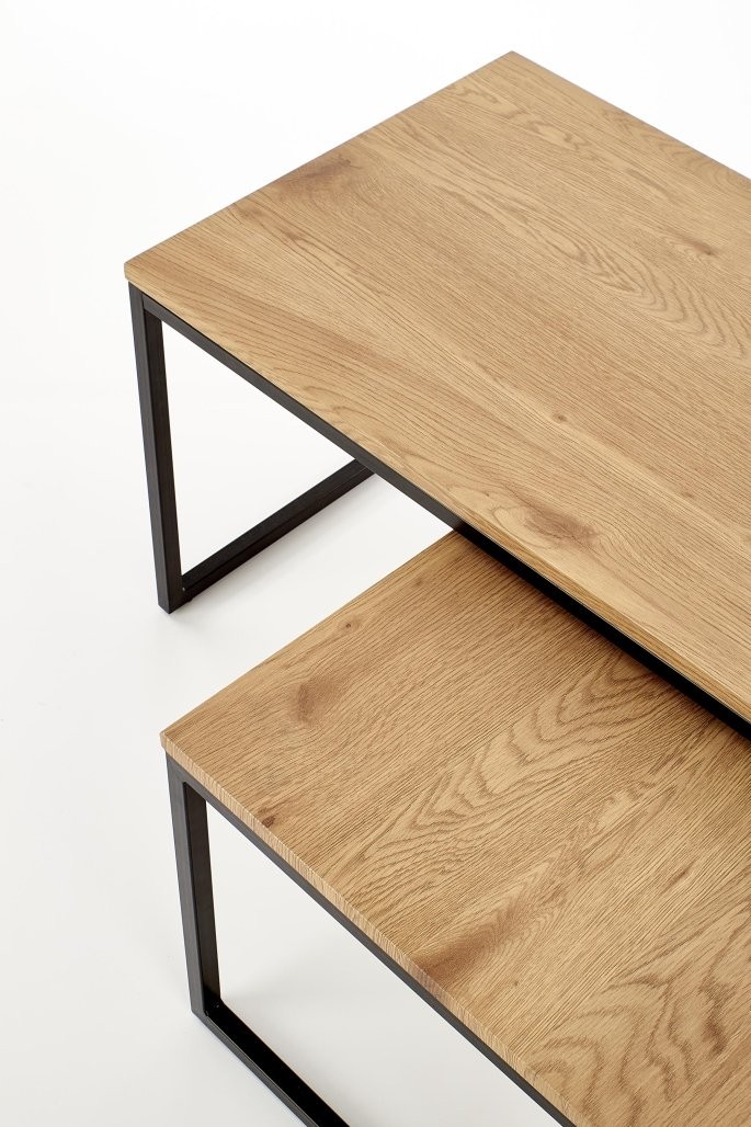 Klub stolić Milar u industrijski stilu s MDF laminiranom površinom u boji zlatnog hrasta i crnim metalnim okvirom. Dvije veličine stolića u kompletu omogućavaju prilagodljivu uporabu u prostoru.