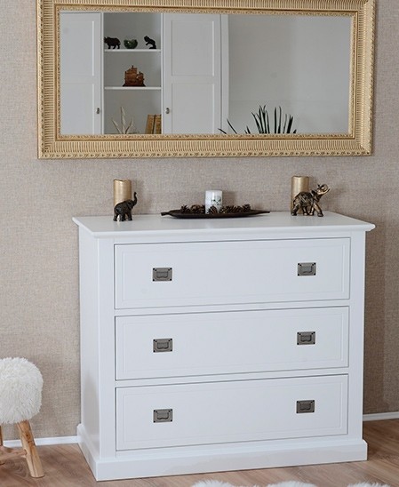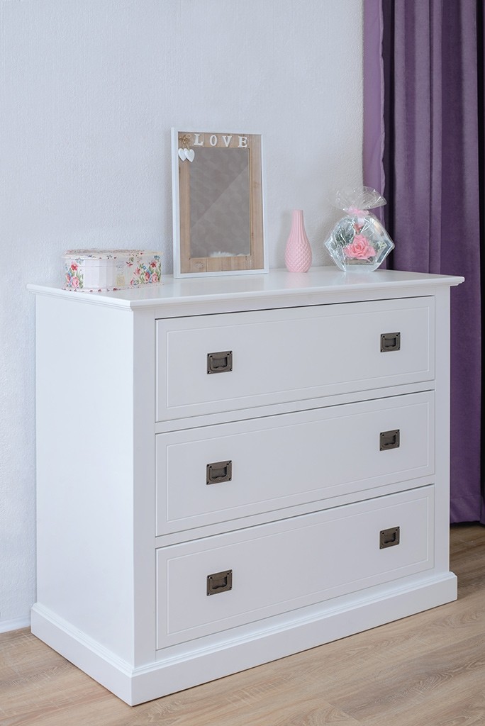 Svestrano upotrebljiva masivna komoda CALM dostupna je u bijeloj boji, koja se odlično uklapa u svaki prostor i istovremeno ga stvara funkcionalnijim. Sadrži tri prostrane ladice, koje vam omogućuju pohranu različitih predmeta, zbog čega će vaš stan uvijek biti uredno pospremljen i organiziran! Ladice sadrže funkciju tihog zatvaranja, koja omogućuje lakšu svakodnevnu upotrebu i spriječava nastajanje oštečenja, zbog čega će vaša komoda ostati lijepo sačuvana još duže vremena!