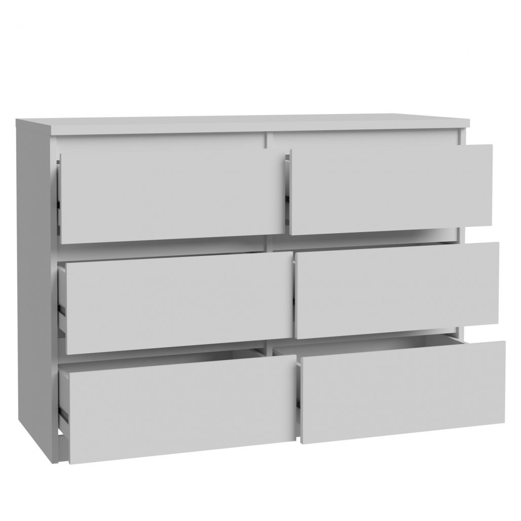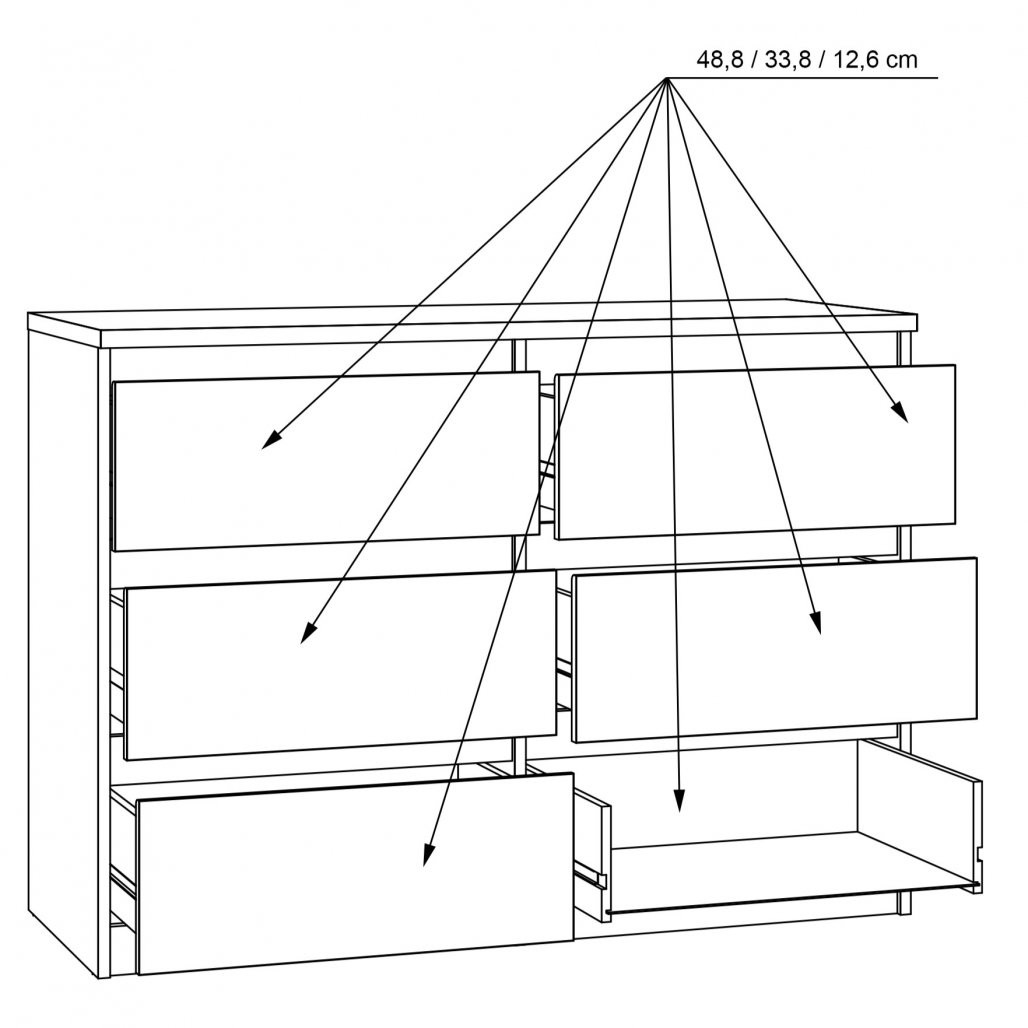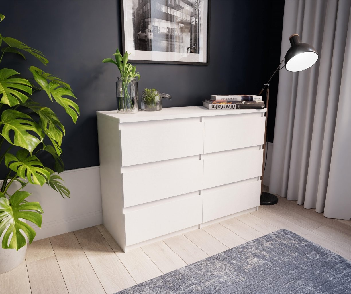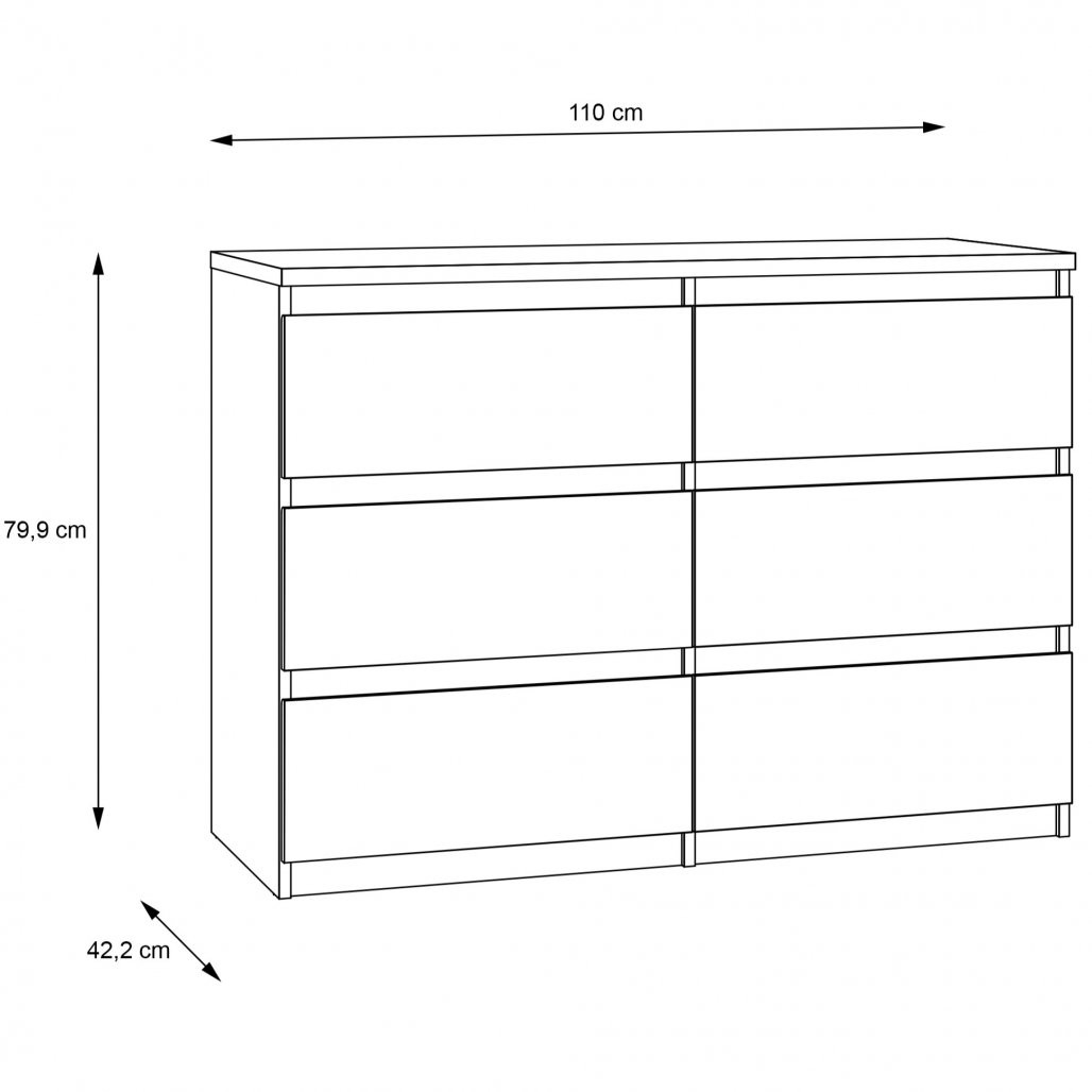 - Velika komoda sa šest ladica bez ručki, dostupna u mat bijeloj boji ili imitaciji hrasta, savršeno će se uklopiti u svaki prostor u kući ili stanu.