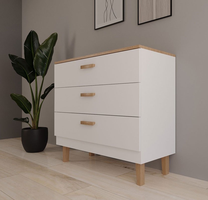 Komoda DENVER dostupna je u kombinaciji hrasta i bijele boje koja se savršeno uklapa u svaki dnevni boravak. Komoda sadrži tri ladice koje pružaju dovoljno prostora za pohranu majica, donjeg rublja ili čarapa.