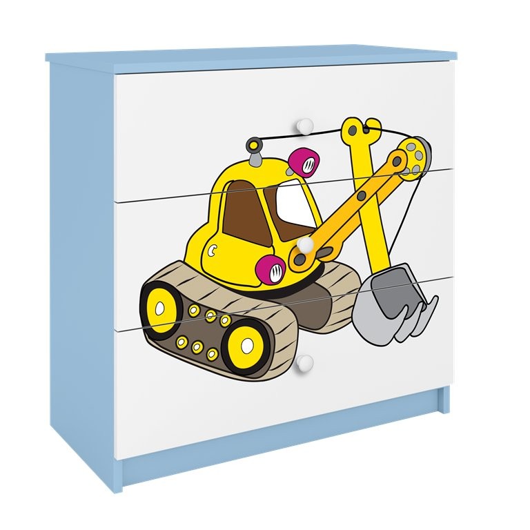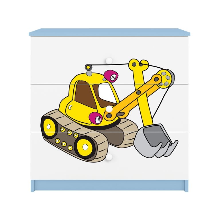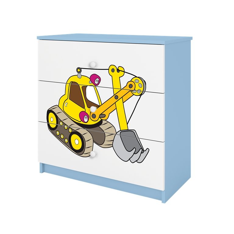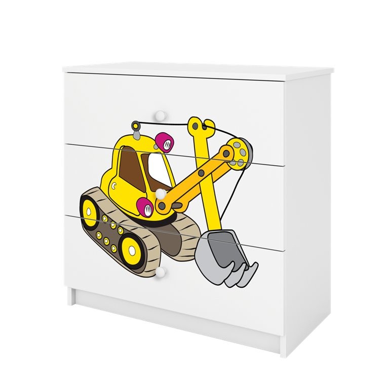Komoda ima tri prostrane ladice koje omogućuju preglednu pohranu odjeće, igračaka ili drugih potrepština. Ladice su postavljene na kotačićne vodilice, što omogućuje jednostavno otvaranje i korištenje. Na cijeloj prednjoj površini nalazi se laminirani motiv bagera koji upotpunjuje izgled proizvoda i istodobno pomaže održati površinu postojanom pri uobičajenom čišćenju. Zbog više varijanti boja komoda je prikladna za različita uređenja dječje sobe.