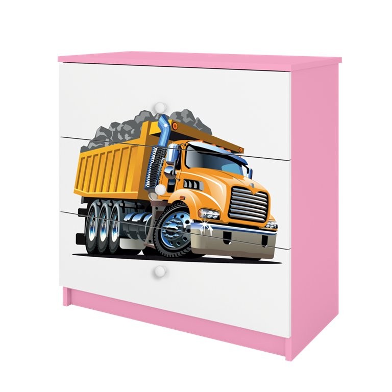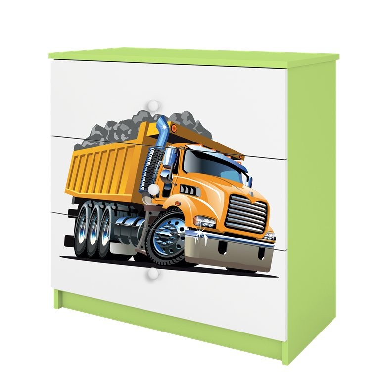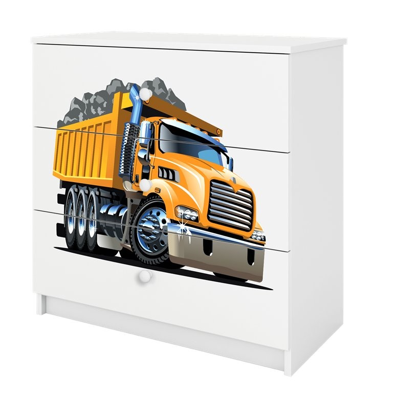 Komoda uključuje tri prostrane ladice za preglednu pohranu odjeće, igračaka ili drugih svakodnevnih potrepština. Ladice su postavljene na kotačićne vodilice, što omogućuje jednostavno otvaranje i zatvaranje. Prednju površinu upotpunjuje laminirani motiv kamiona koji doprinosi izražajnom izgledu proizvoda i istodobno pomaže održati površinu prikladnom za uobičajeno čišćenje. Zbog više varijanti boja komoda je prikladna za različite dječje sobe.