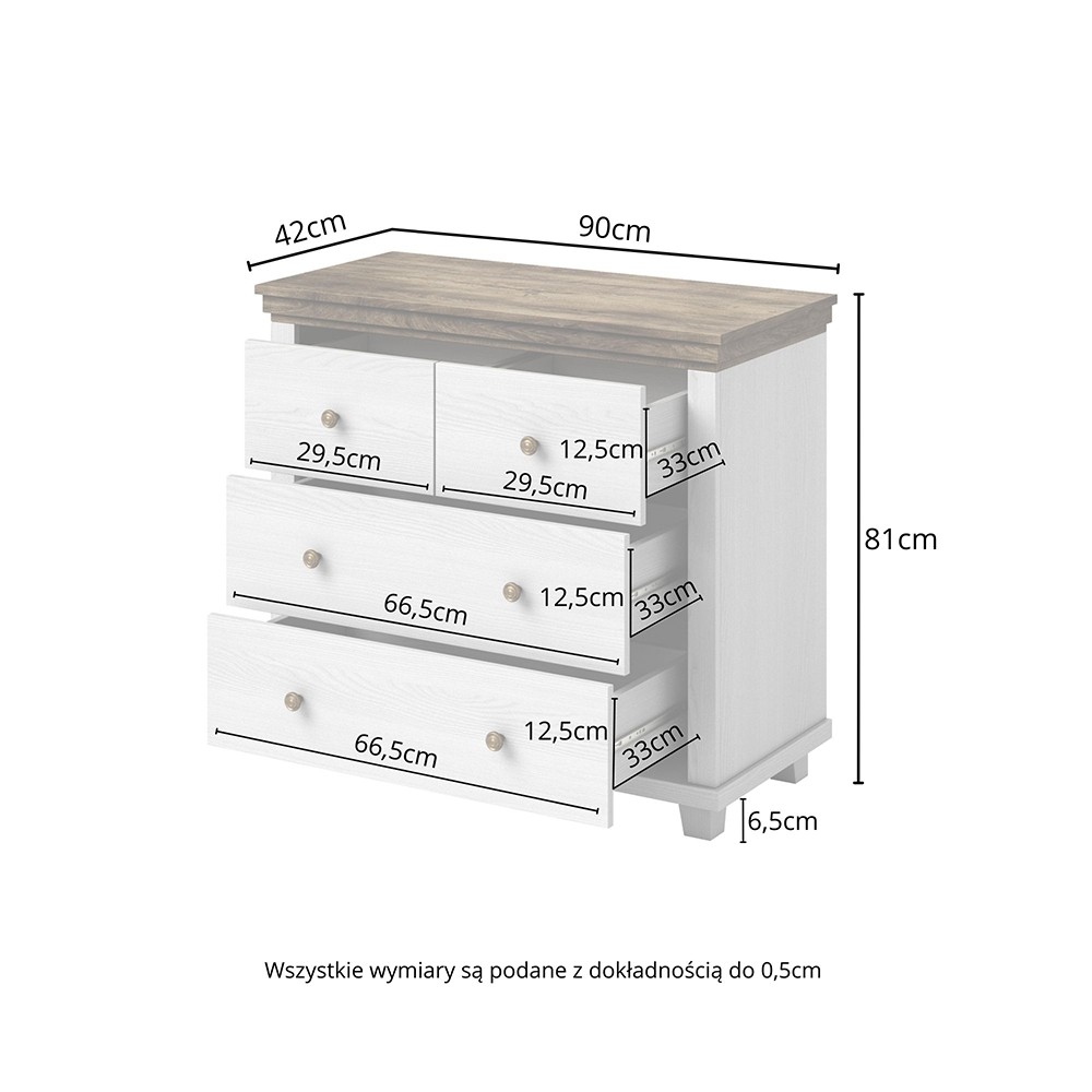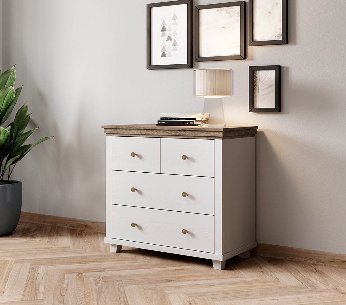 Komoda EVORA dostupna je u bijeloj boji abisko pepela s primjesom hrasta. Zbog neutralne bijele boje savršeno se uklapa u svaku spavaću sobu. Ima puno prostora za pohranu u koji možete pohraniti donje rublje, čarape i drugu odjeću.