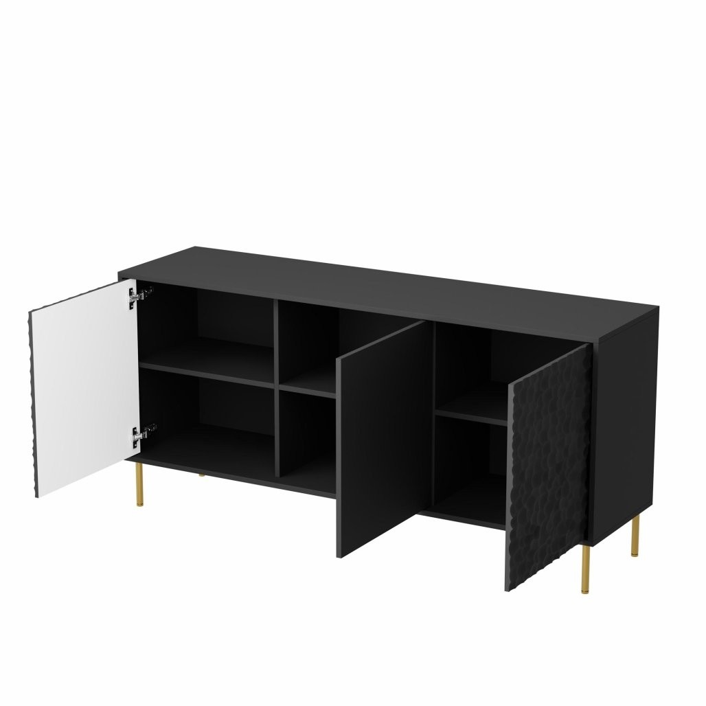 Komoda Inlar u elegantnoj crno-zlatnoj kombinaciji savršena je za moderni stil i je idealna za dnevne ili spavaće prostore.