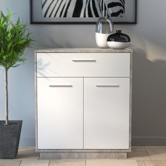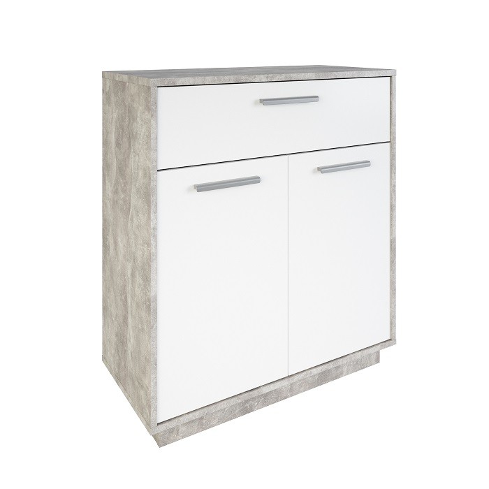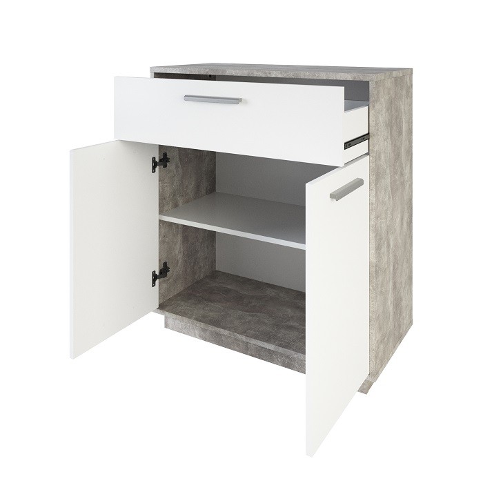 Komoda LEO 309104 je komoda u kombinaciji bijele boje i imitacije cementa. Odozgora ima ladicu, ispod pa dvoja vrata i u unutrašnjosti policu, koju možete podesiti na tri različite visine. Pogledajte si još ostale elemente iz programa Leo.