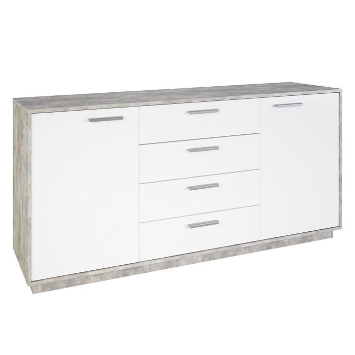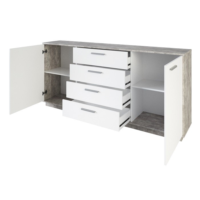 Komoda LEO 309107 je komoda u kombinaciji bijele boje i imitacije cementa. Na svakoj strani ima vrata i u unotrašnjosti policu, koju možete podesiti na tri različne visine, na sredini ima četiri ladice. Pogledajte si još ostale elemente iz programa Leo.