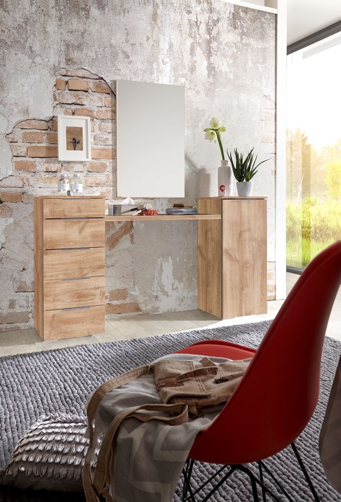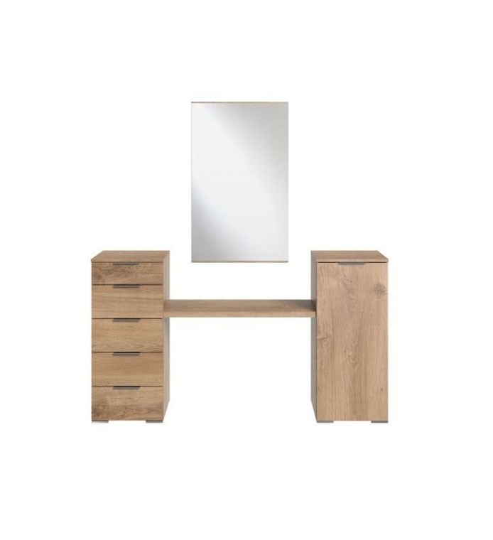 Komoda LEVEL je jednostavna komoda njemačkog dizajna koja se može pohvaliti jednostavnim dizajnom i funkcionalnošću. Kombinacija boje hrasta i velikog ogledala izgledat će sjajno u svakoj sobi. Komoda ima 5 metalnih ladica s lijeve strane i ormar s dvije fiksne police na drugoj. Između lijevog i desnog ormarića nalazi se prostrani stol tako da komodu možete koristiti kao kozmetički stol.