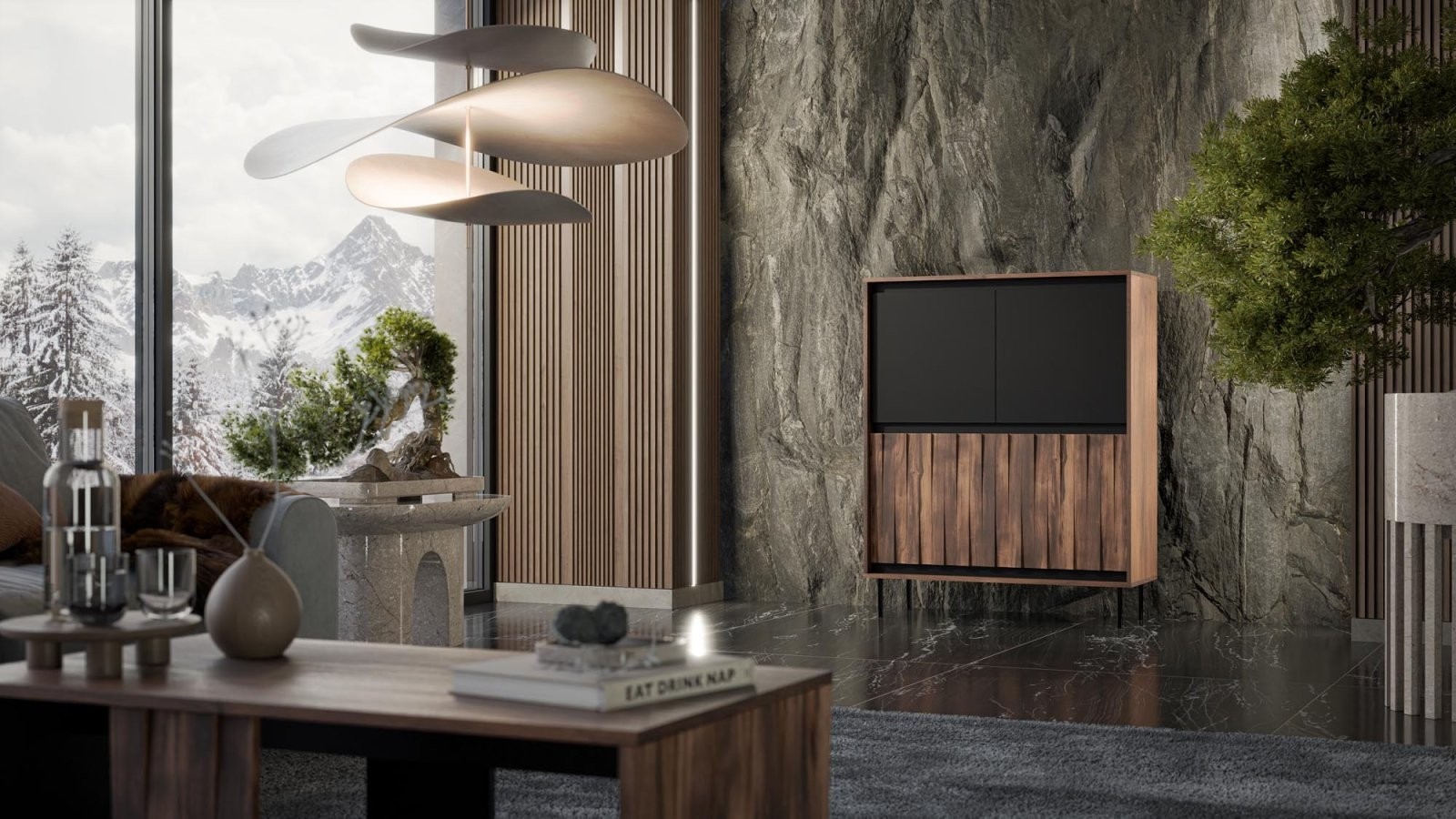 Komoda Olmar u kombinaciji oraha i crne boje u modernom dizajnu. Dimenzije 102 x 40 x 128 cm od materijala laminirane iverice i MDF ploče pružaju dovoljno prostora za pohranu u svakom prostoru.