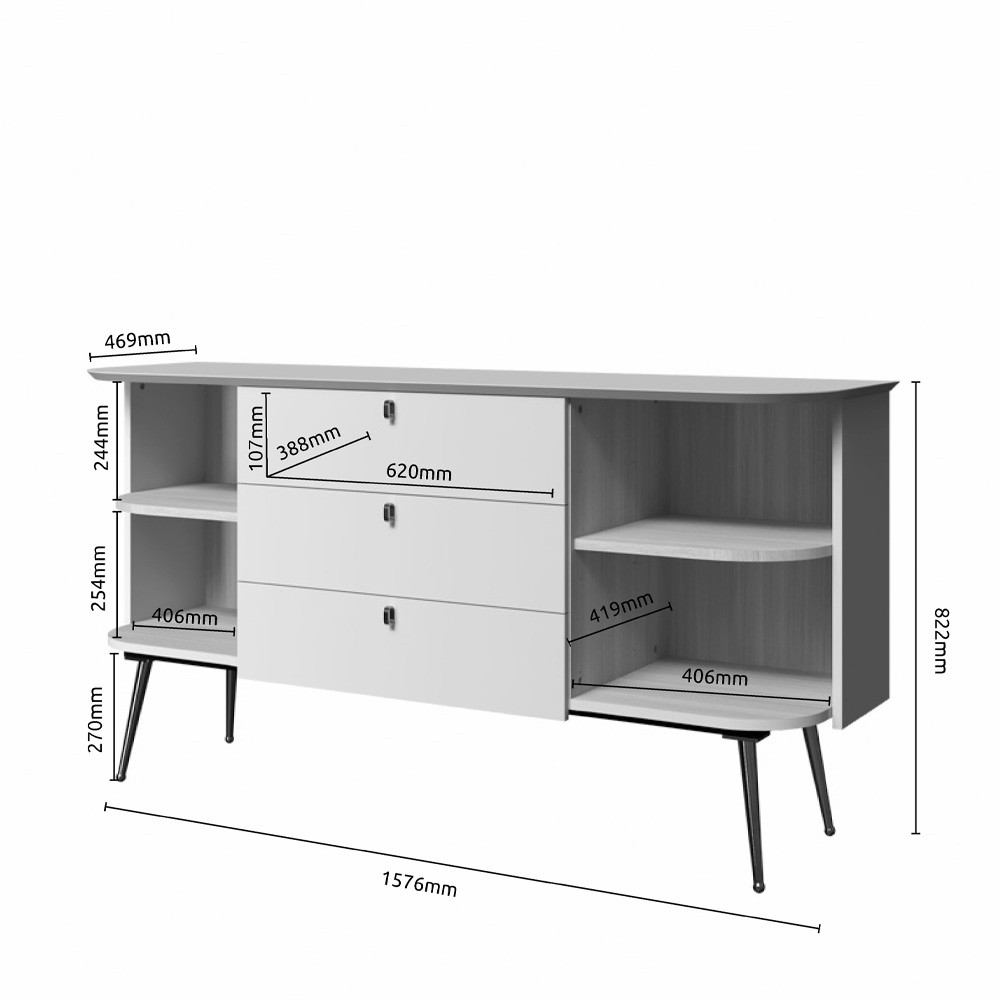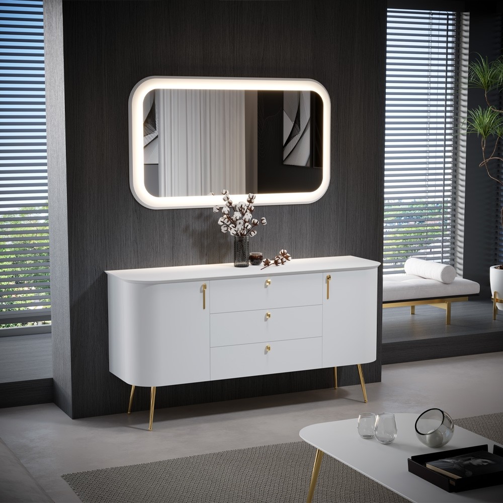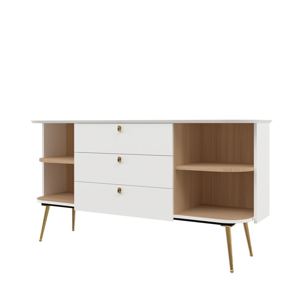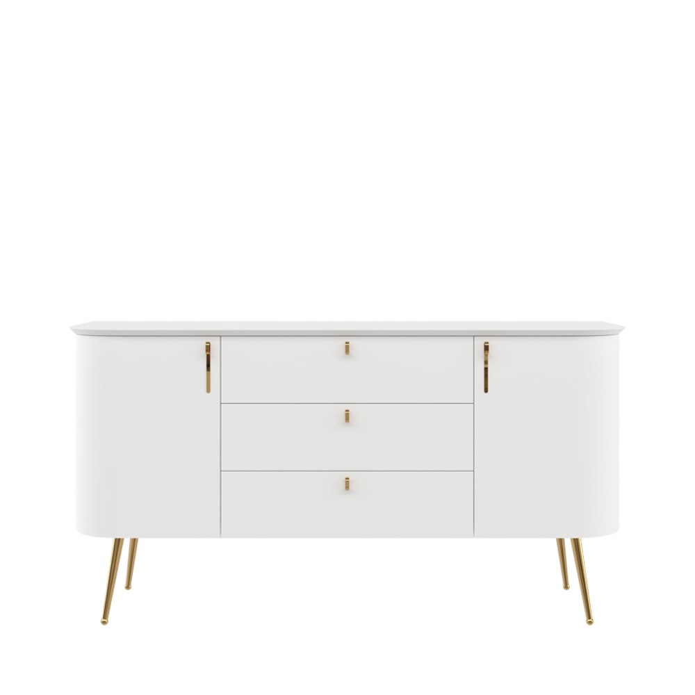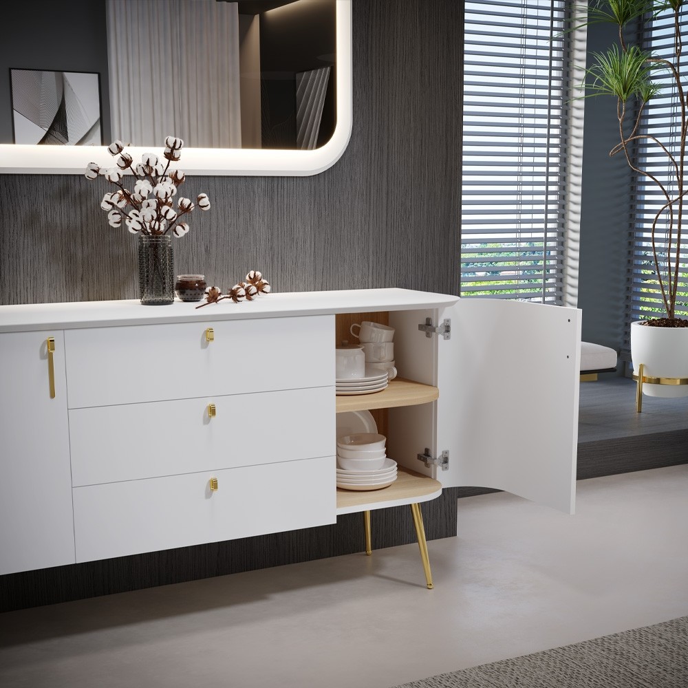 Komoda RADDA GALET s tri ladice i dvokrilnim vratima pruža praktično i pregledno odlaganje za svakodnevnu uporabu. Zlatne ručkice, visoke nožice i diskretne zaobljene linije daju joj elegantan izgled, dok mehanizam mekog zatvaranja omogućuje tiho zatvaranje ladica i vrata. Savršena kombinacija forme i funkcionalnosti podiže cjelokupan interijer vašeg dnevnog boravka na višu razinu.