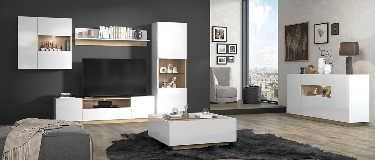 Prostorna komoda Radda Tena se bo zaradi svojega preprostega videza odlično podala v vsak prostor! Na voljo je v barvni kombinaciji bukev ali oreh in bele barve v visokem sijaju. Zunanji deli omare imajo 4 plasti UV laka, zato je komoda bolj odporna na praske in poškodbe. Omara ima soft-close mehanizem, ki vam omogoča tiho zapiranje in dolgoletno uporabo, saj prepreči hitro obrabo. Odprti del omare z dekoracijo v barvi lesa vključuje LED osvetlitev, ki bo še dodatno poudarila vaše dragocenosti in izboljšala izgled celotne komode. Komoda je izdelana iz oplemenitene iverne plošče.
