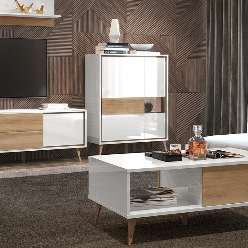 Komoda RADDA VIDA je del kolekcije dnevne sobe RADDA VIDA, ki se ponaša z imenitnim retro videzom, ki je bil moderen v 60. letih. Lesene nogice pripomorejo k retro videzu, visoki sijaj bele barve in pacifičnega oreha pa dodata bolj moderen pridih, ki še bolj polepša vaš dnevni prostor.