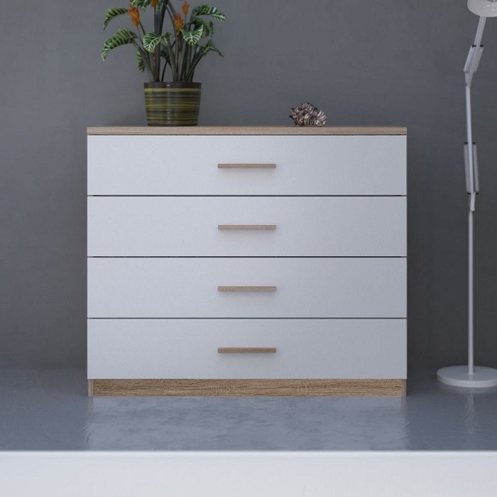 Komoda SELA je praktična komoda, koja je u kombinaciji brušenog hrasta i bijele mat boje. Debljina elemenata je 15 mm, osim gornje ploče, koja je debljine 22 mm. Komoda ima 4 ladice, koje su u dimenziji 94x11x37 cm. Pogledajte si još ostale artikle iz istog programa.
