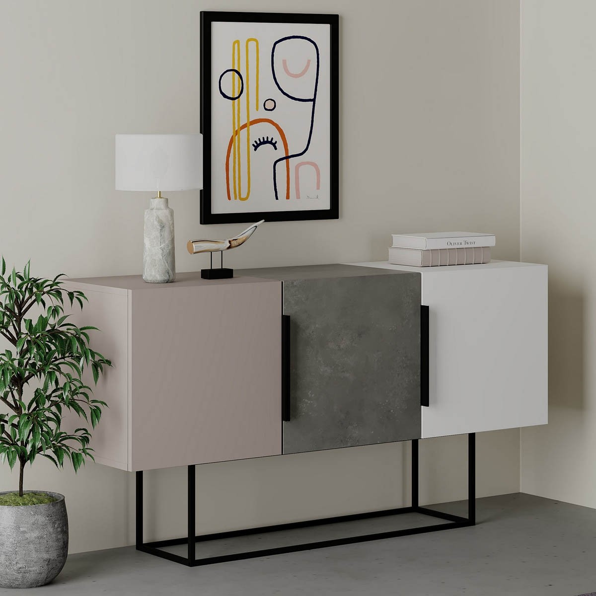KOMODA TONTINI modernog je izgleda i izdignuta sa tla, što olakšava čišćenje ispod. To je vrlo korisno, jer se prašina i prljavština mogu nakupiti na podu i otežati održavanje čistoće. Osim toga, nudi troja vrata za koja možete pospremiti mnogo stvari koje trenutno donose nered u vaš prostor.