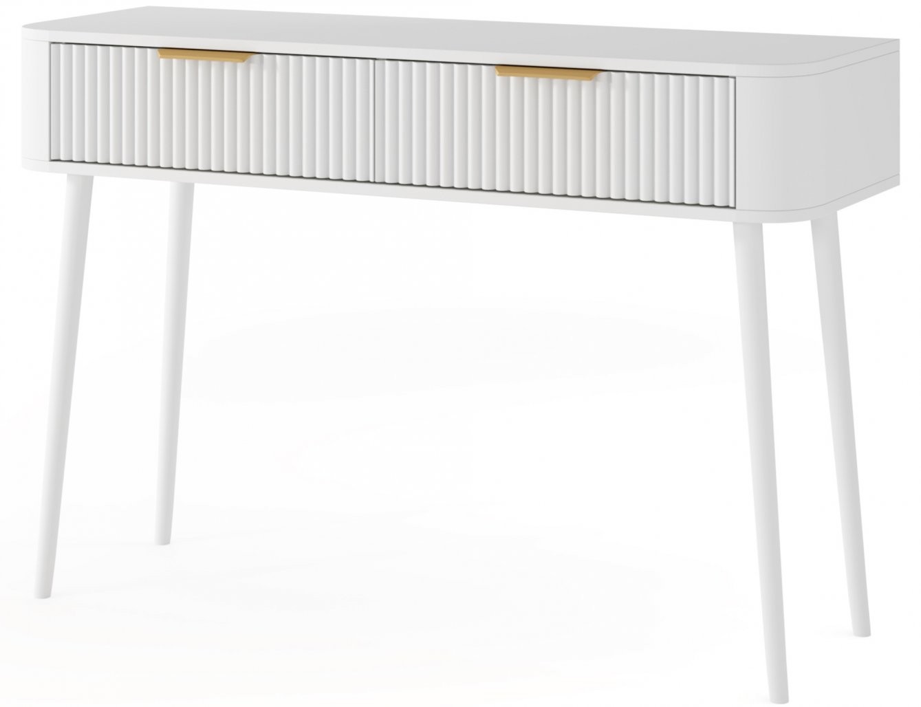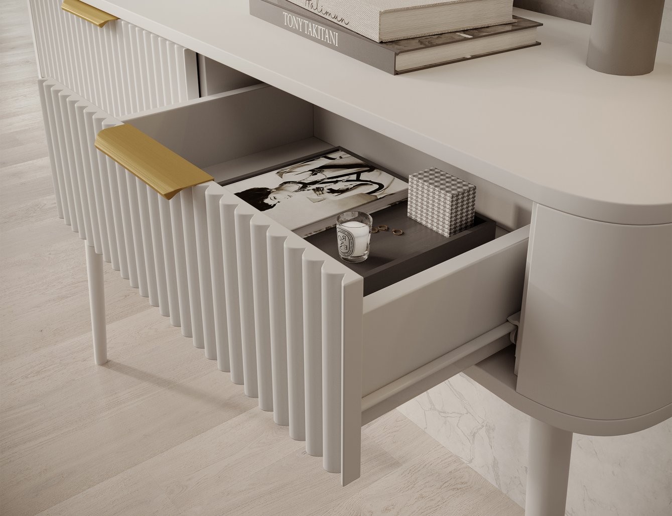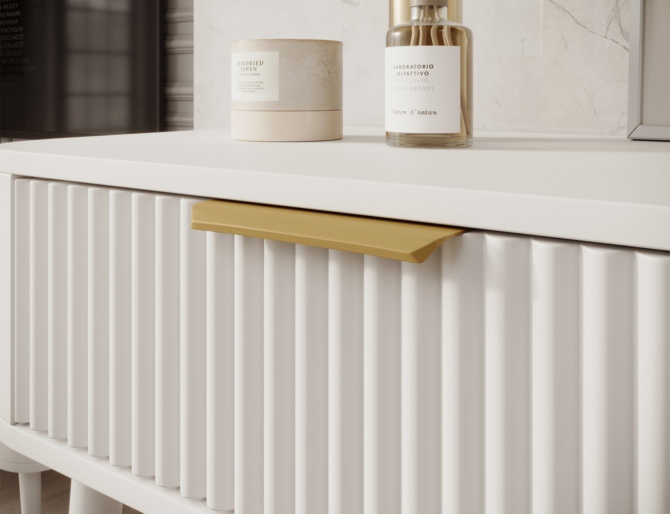Prednji dio komode izrađen je od izdržljivog MDF-a s ABS rubom i rebrastim uzorkom, što joj daje profinjen karakter i stilski izgled. Korpus, izrađen od laminirane iverice, osigurava čvrstoću i otpornost na svakodnevno habanje. Komoda je opremljena s dvije praktične ladice na vodilicama s valjkastim ležajevima za glatko i tiho otvaranje i zatvaranje, nudeći praktičan prostor za pohranu. Zlatne metalne ručke naglašavaju njezin moderni stil.