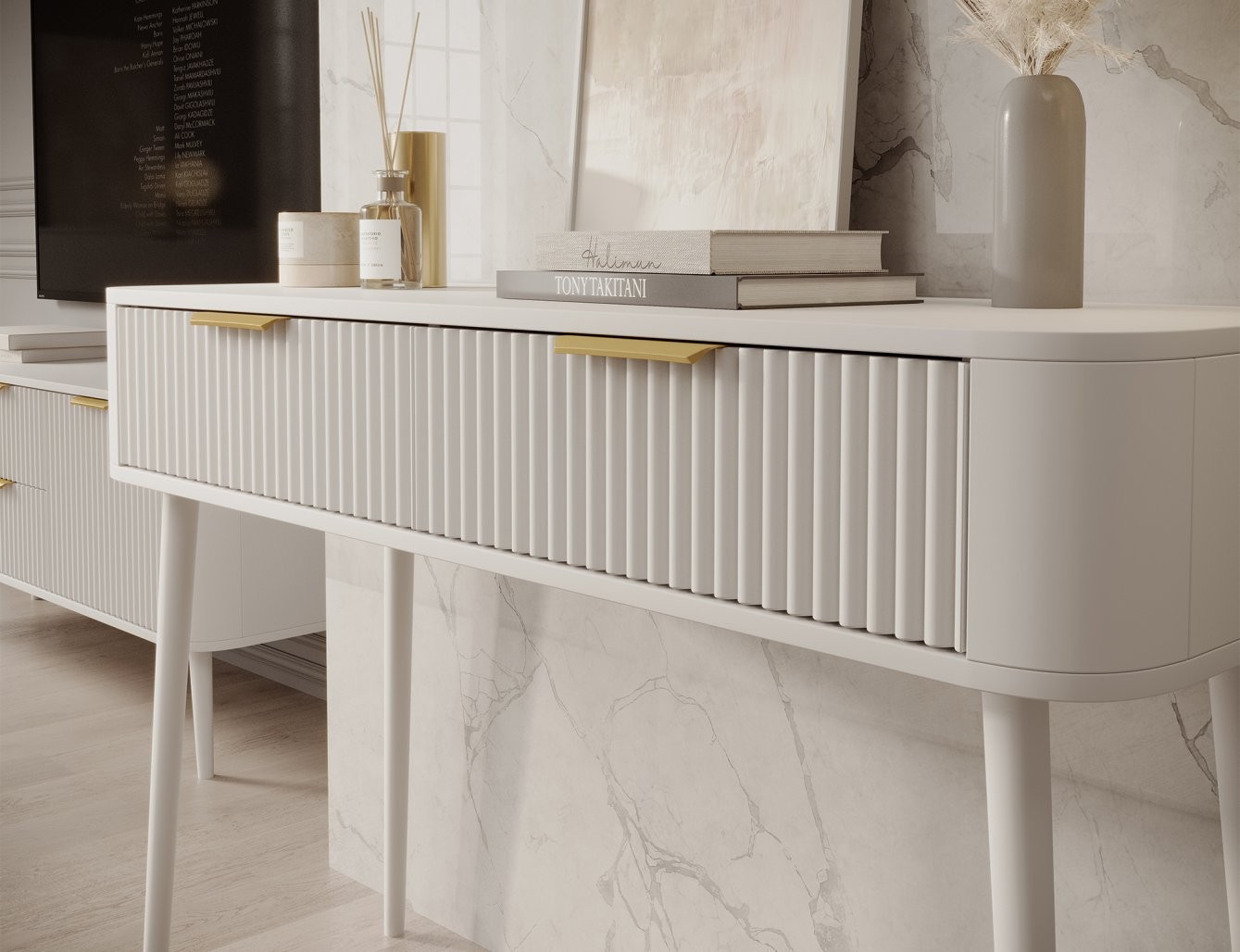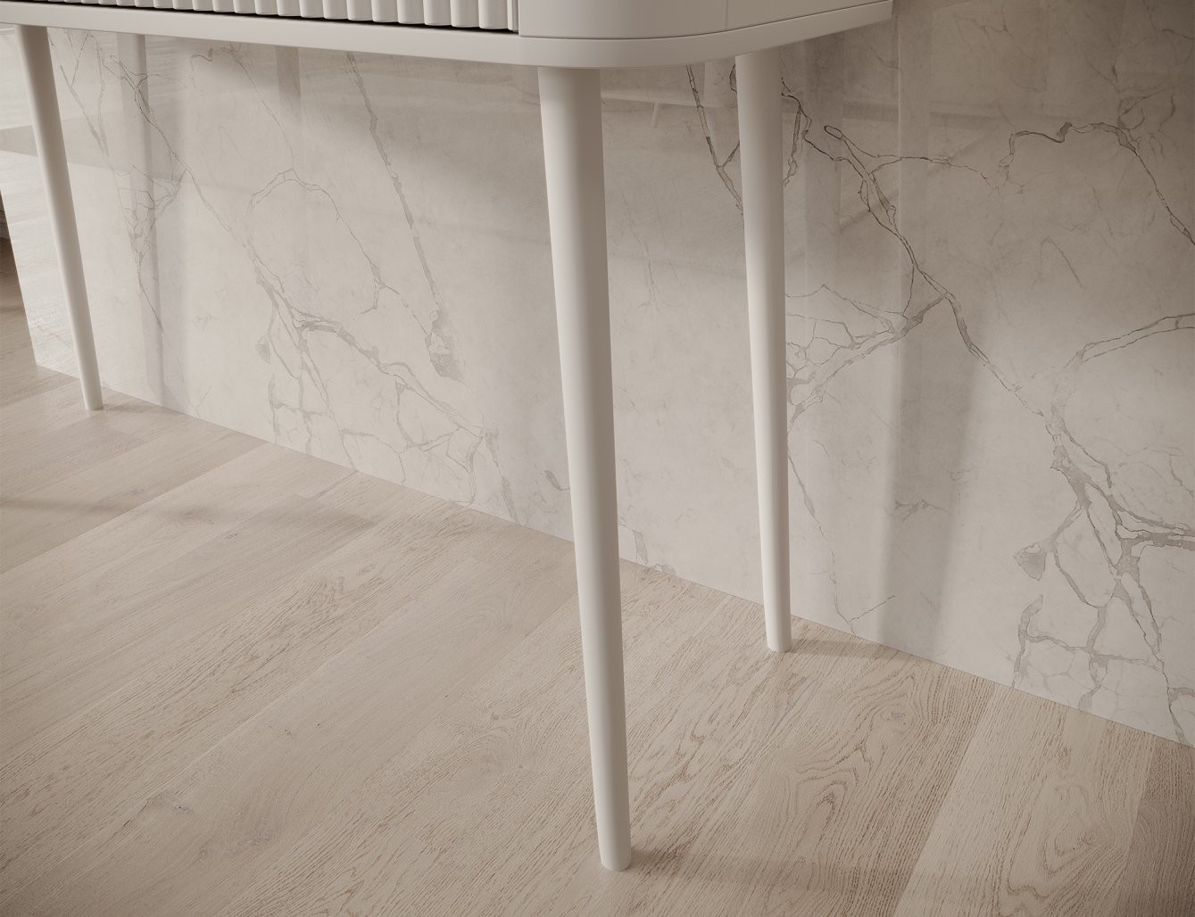 Visoke bijele drvene noge (60 cm) dodaju eleganciju i olakšavaju upotrebu te čišćenje ispod komode. Konzolna komoda Chavelle kombinira bezvremenski dizajn, funkcionalnost i visoku kvalitetu izrade, čineći je izvrsnim dodatkom svakom modernom interijeru.