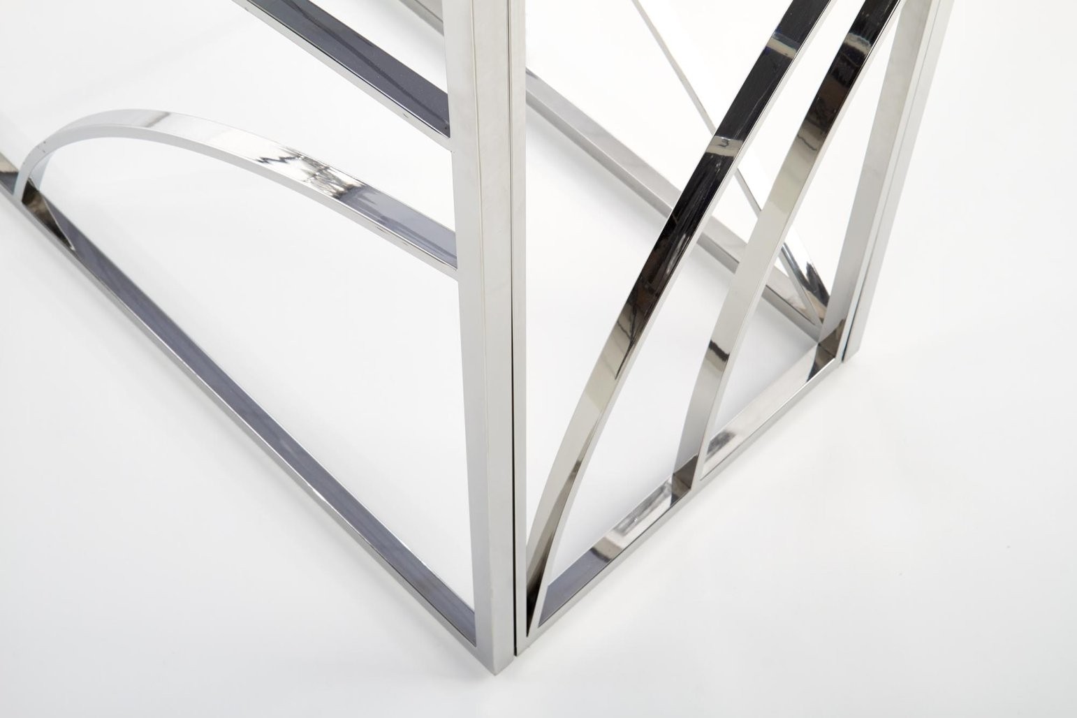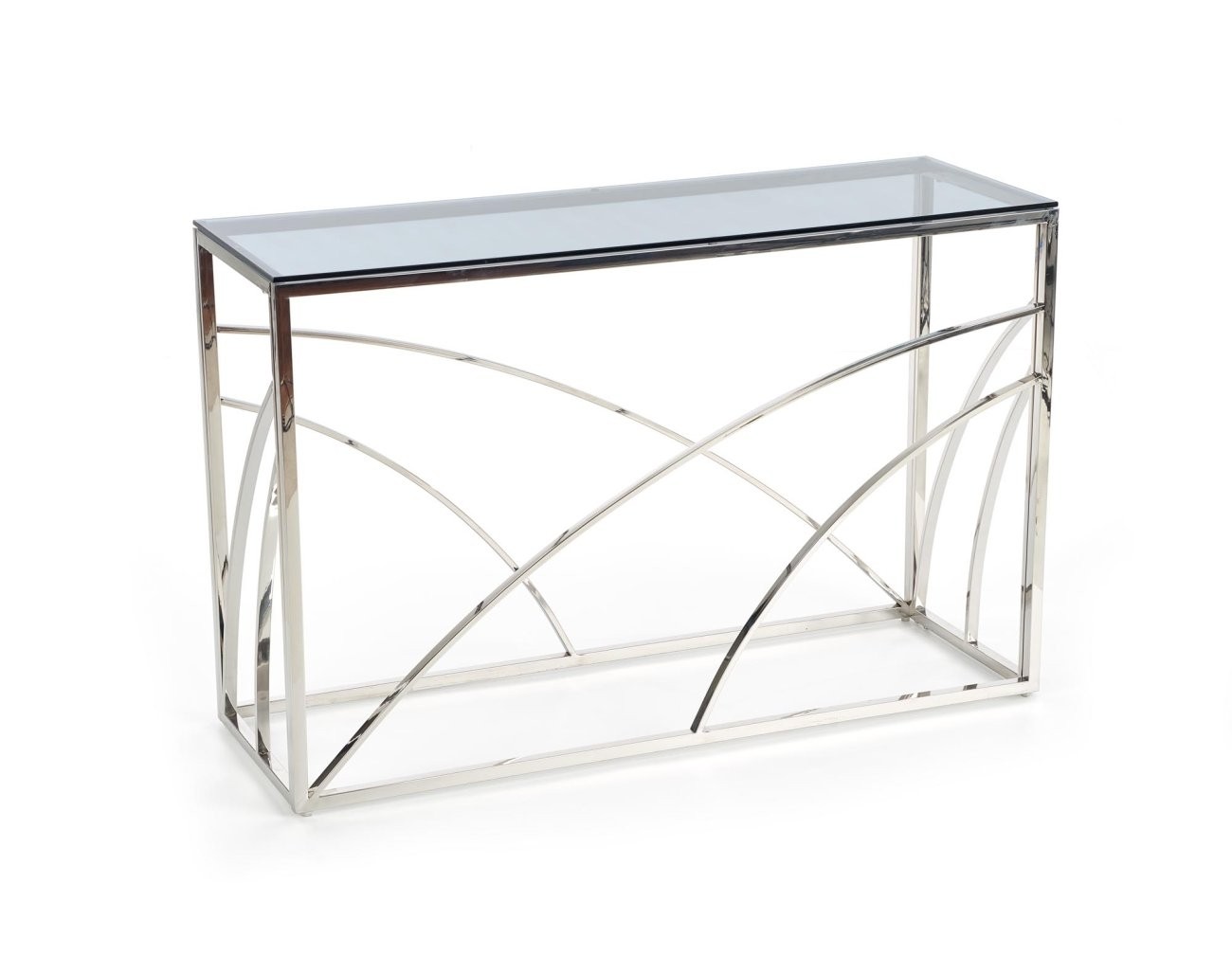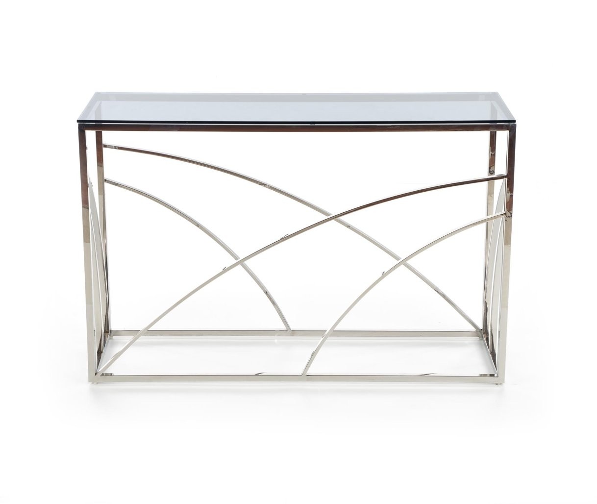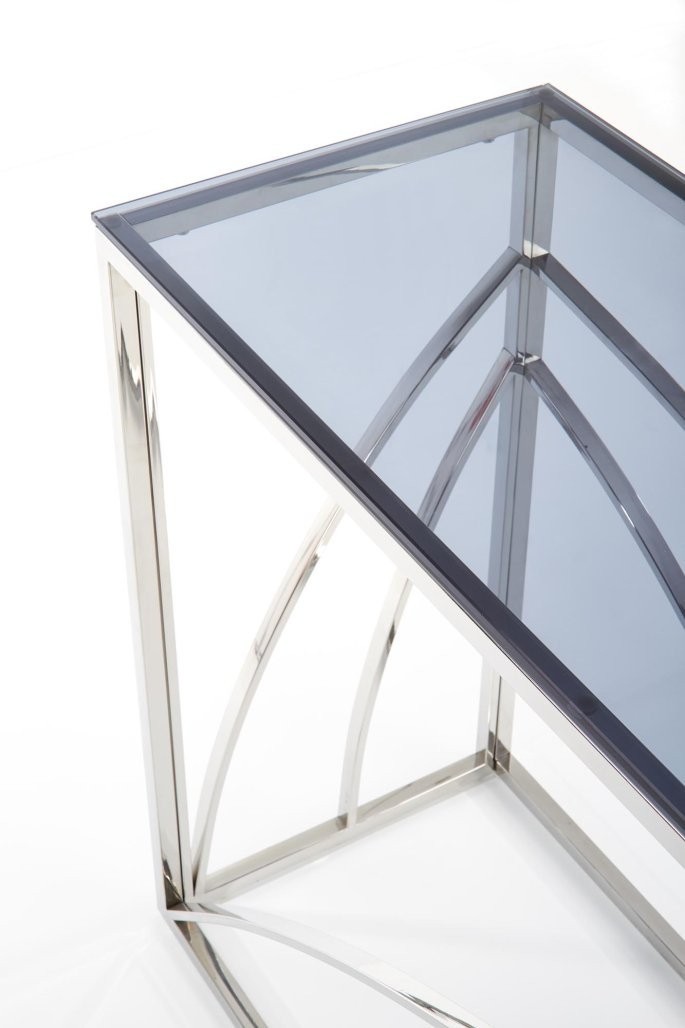 Konzolni stol Glan s dimljenim staklom i metalnim nogama u srebrnoj boji. Dodaje dozu prestiža i elegancije u hodnike ili dnevne prostore.