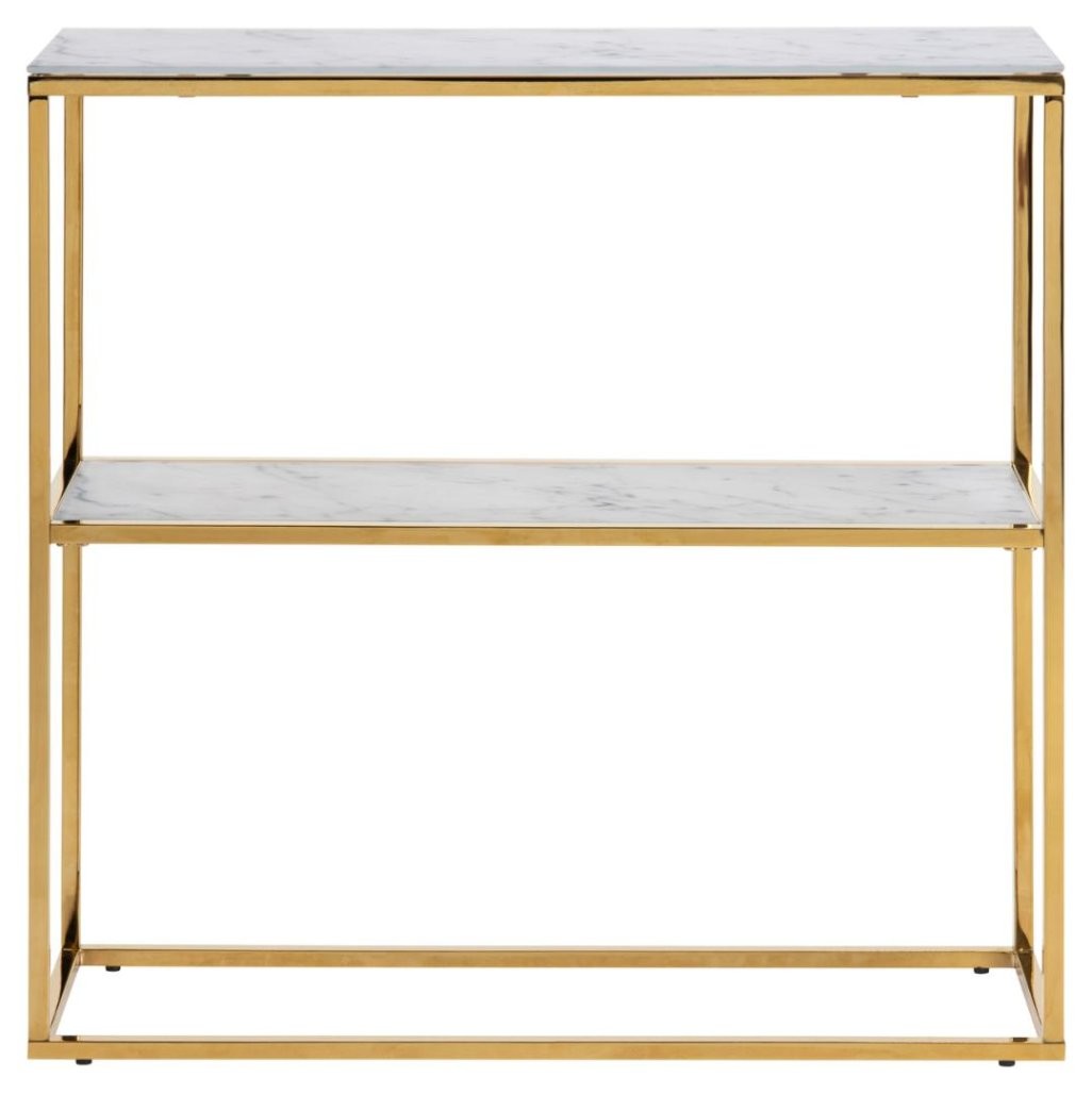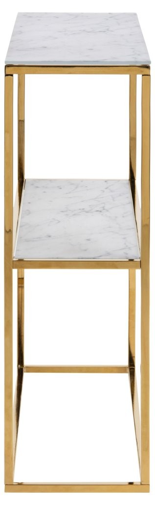 Konzolni stolić Ionica predstavlja savršenu kombinaciju modernog dizajna i funkcionalnosti. Njegov stilizirani izgled sa kaljenim staklenom vrhom koji imitira izgled mramora, dodat će ekskluzivnost vašem domu, kromirani metal sa zlatnim završetkom donosi osjećaj luksuza. Ovaj komad namještaja je nezamjenjiv za hodnik, spavaću sobu ili životni prostor, jer pruža dodatnu površinu za prikaz i pohranu vaših omiljenih stvari.