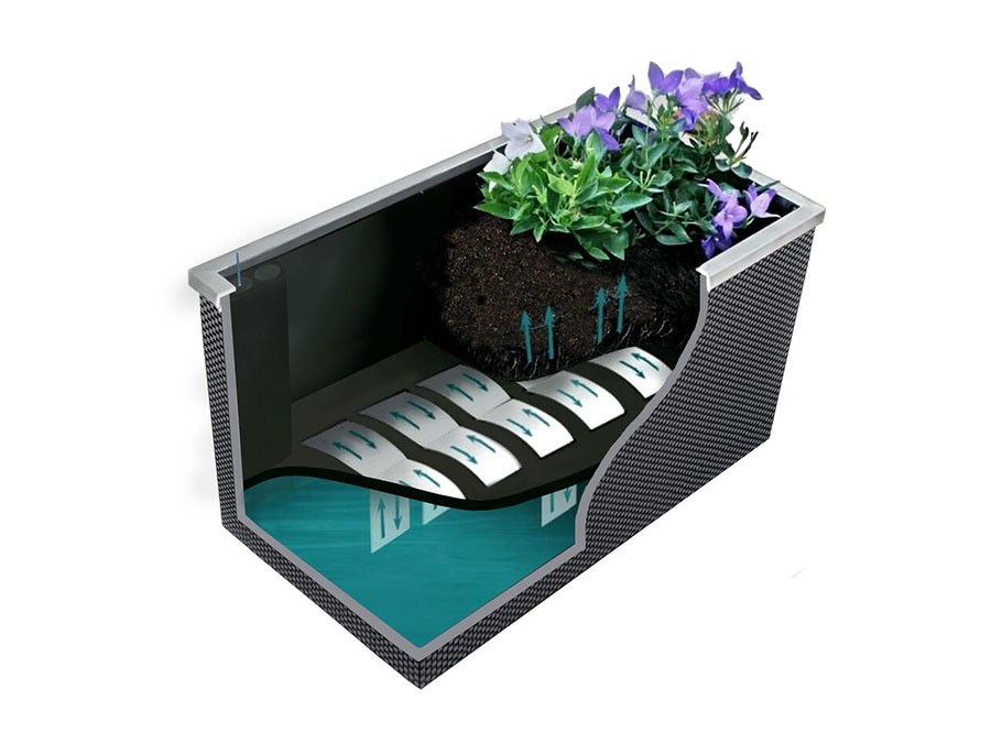 Korito je opremljeno sa samo-zalivenim sistemom. Unutrašnjost korita je napravljena iz pocinčanog čelika. Vani je prekrita s ratanom i završeno s poliranim aluminijem. Biljke možete dati direktno u korito. Korito je opremljeno sa zalivenim sistemom, koji biljki postepeno dovaža vodu.