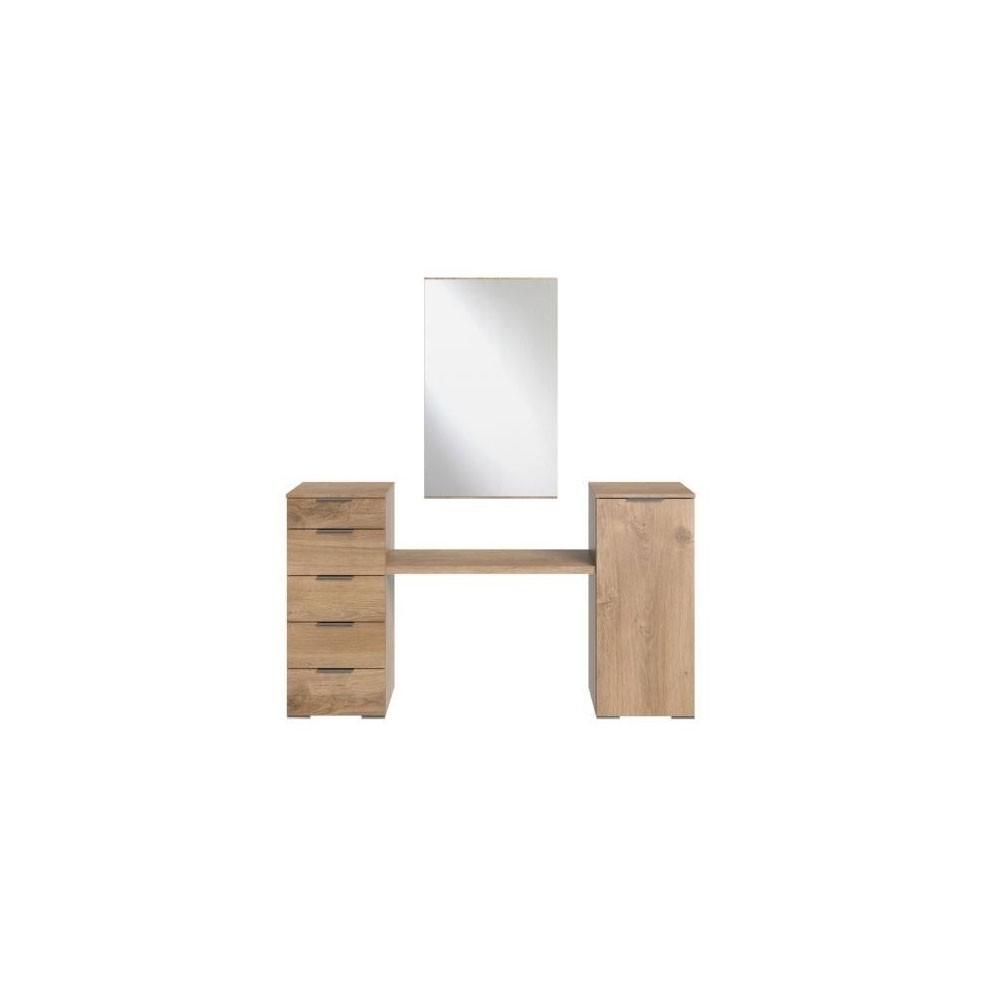 Jednostavan stol za kozmetiku u boji prirodnog hrasta, sa ogledalom i širokim stolom. Stol je savršen za ljude koji malo više ulažu u kozmetiku, jer ima ogledalo u koje se možete pogledati, kao i pet ladica u koje možete pohraniti kozmetiku i časopise kako biste ih uvijek imali pri ruci. Stol ima pet ladica za odlaganje na lijevoj strani s metalnim ručkama. Ima dvije fiksne police i vrata koja se otvaraju na vani. Stol stoji na osam nogu četvrtastog oblika.