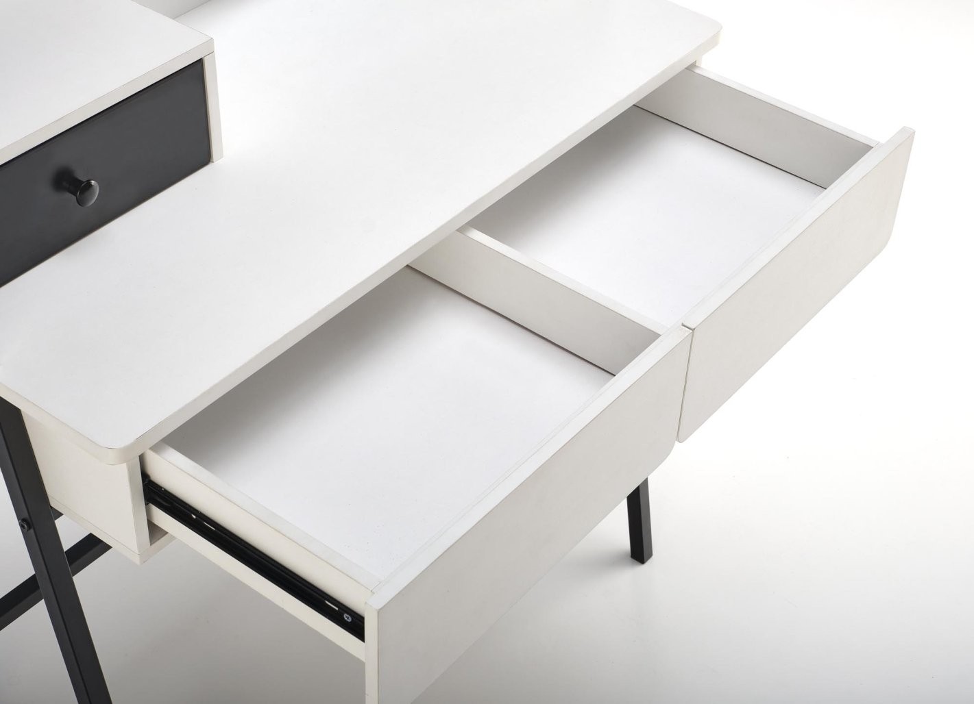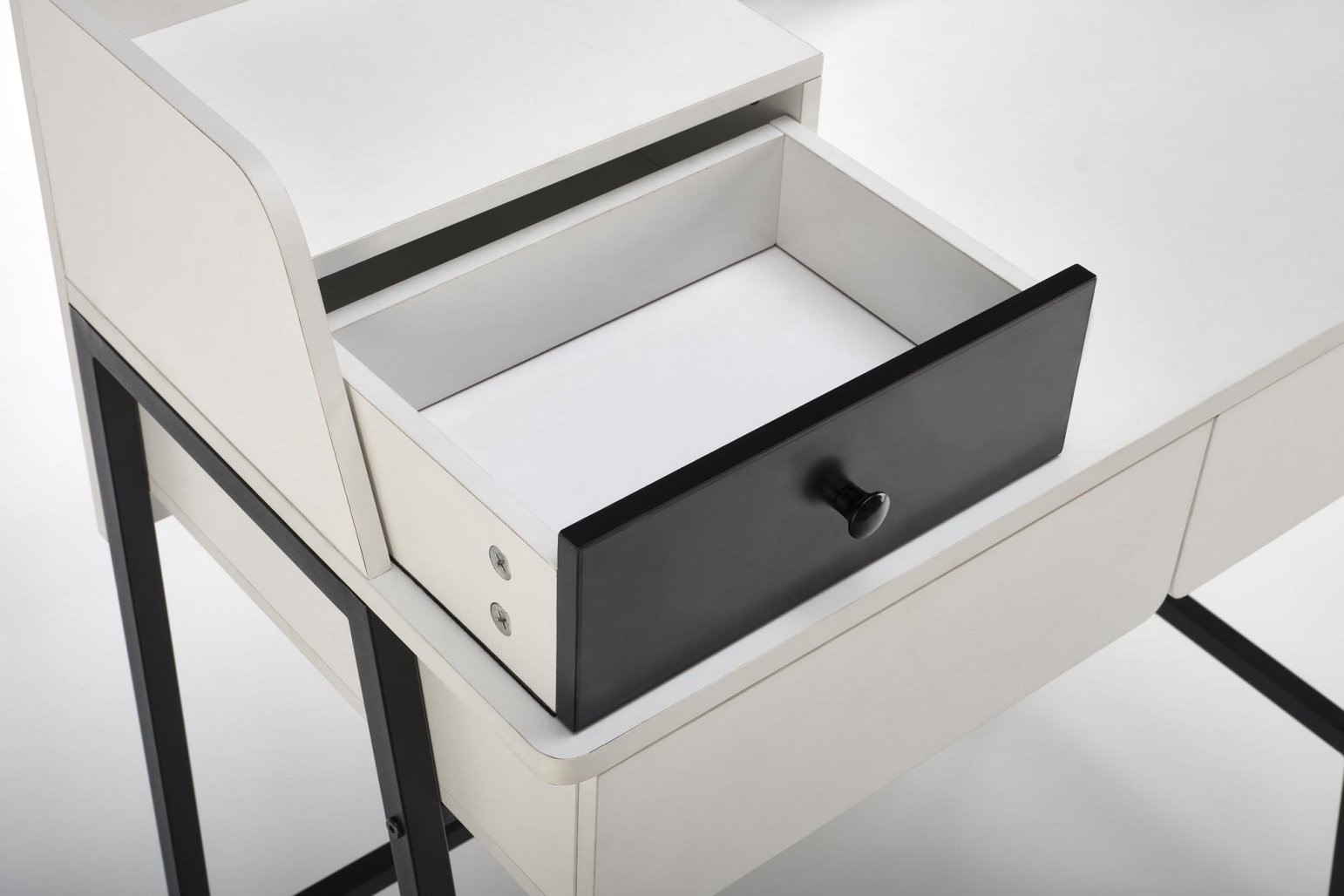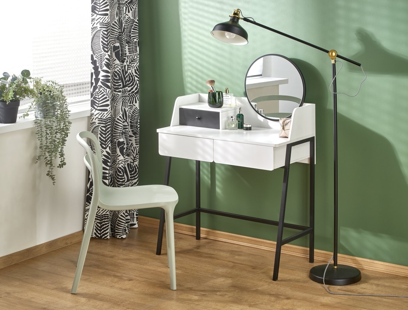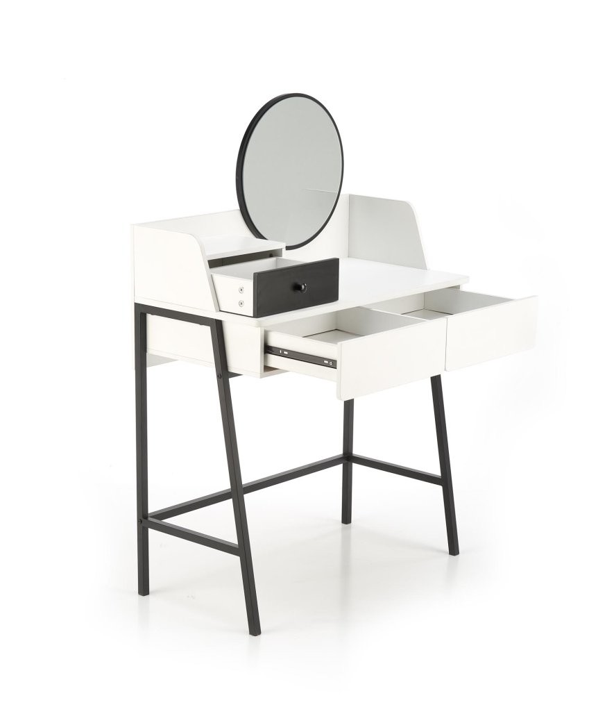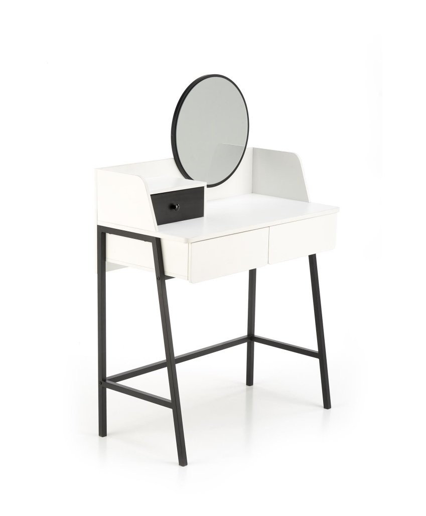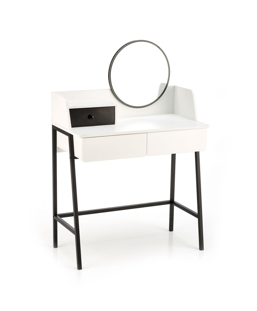 Toaletni stolić Larin s ogledalom i elegantnom crno-bijelom kombinacijom praktičan je i stiliziran dodatak za svaku spavaću sobu ili kupaonicu. Donosi jednostavan, ali elegantan izgled.