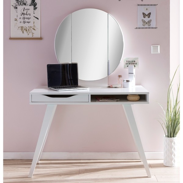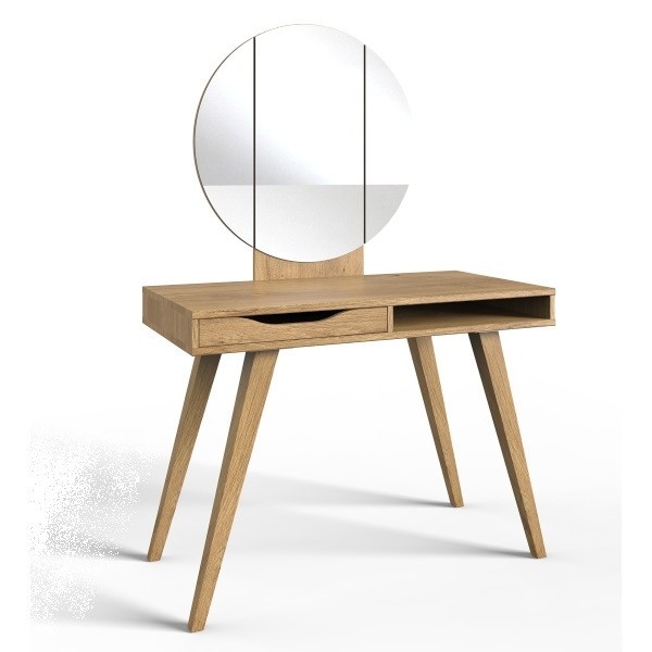 Kozmetički stol DAKOTA ima izuzetan skandinavski izgled koji uljepšava i modernizira svaki dom. Stol je dostupan u bijeloj i hrast boji te uključuje jednu ladicu, jednu otvorenu policu i okruglo trodijelno ogledalo. Njemačka kvaliteta osigurava dugotrajnu trajnost i kvalitetu, tako da kozmetički stol možete koristiti dugo vremena.
