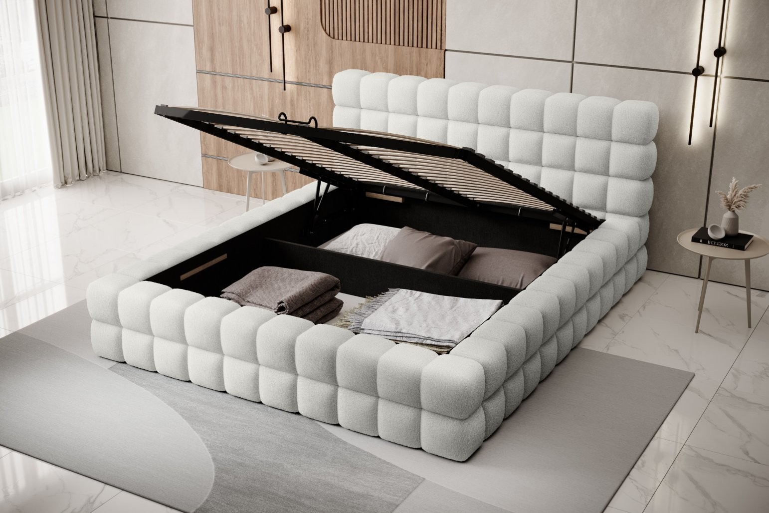 Metalni okvir jamči dugotrajnost konstrukcije, dok crna plastična nogica visine 2 cm osigurava stabilnost. Krevet također ima jedan prostor za pohranu, što krevet Dizzle 140 čini praktičnim i za odlaganje dodatnih predmeta kao što su posteljina ili pokrivači. S 36 letvica za ravnomjernu potporu madracu, krevet Dizzle, svojim oblikom koji podsjeća na elegantnu kocku, unosi jedinstven dizajn i udobno opuštanje u vašu spavaću sobu.