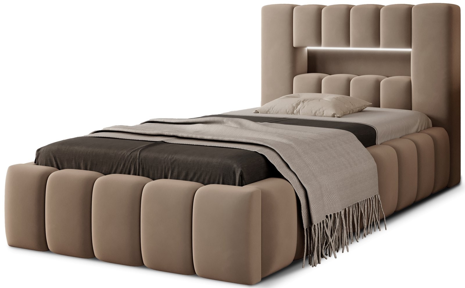 Krevet Lamica 90x200 savršen je izbor za one koji žele glamuroznu udobnost i modernu eleganciju u svojoj spavaćoj sobi. Sa svojim jedinstvenim oblikom i mekom strukturom očarava na prvi pogled, dok dodatnu udobnost pružaju visoko uzglavlje i bočne stranice obložene pjenom. Krevet uključuje i praktično spremište za posteljinu te LED rasvjetu uzglavlja za ugodnu atmosferu.