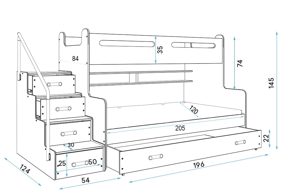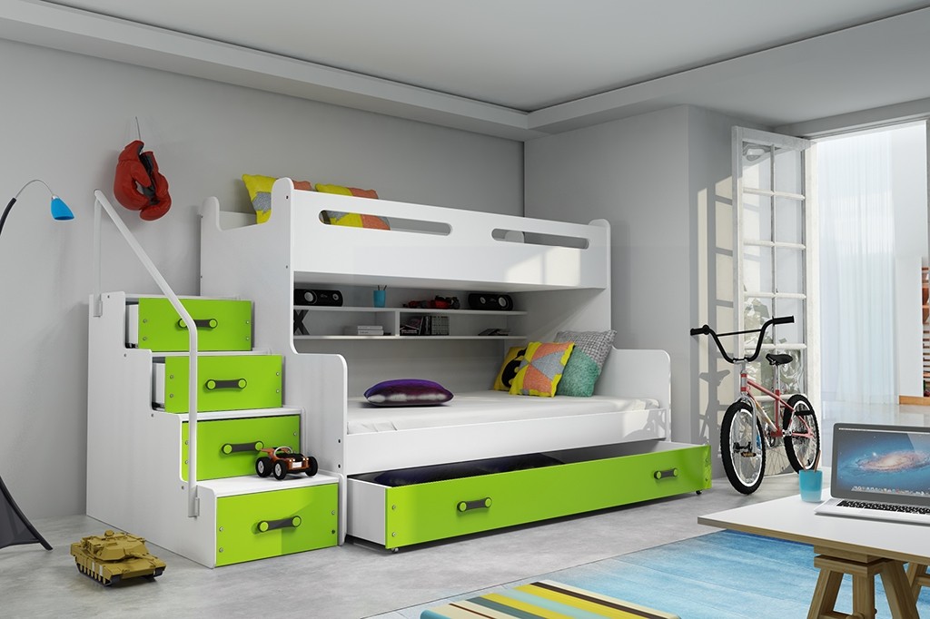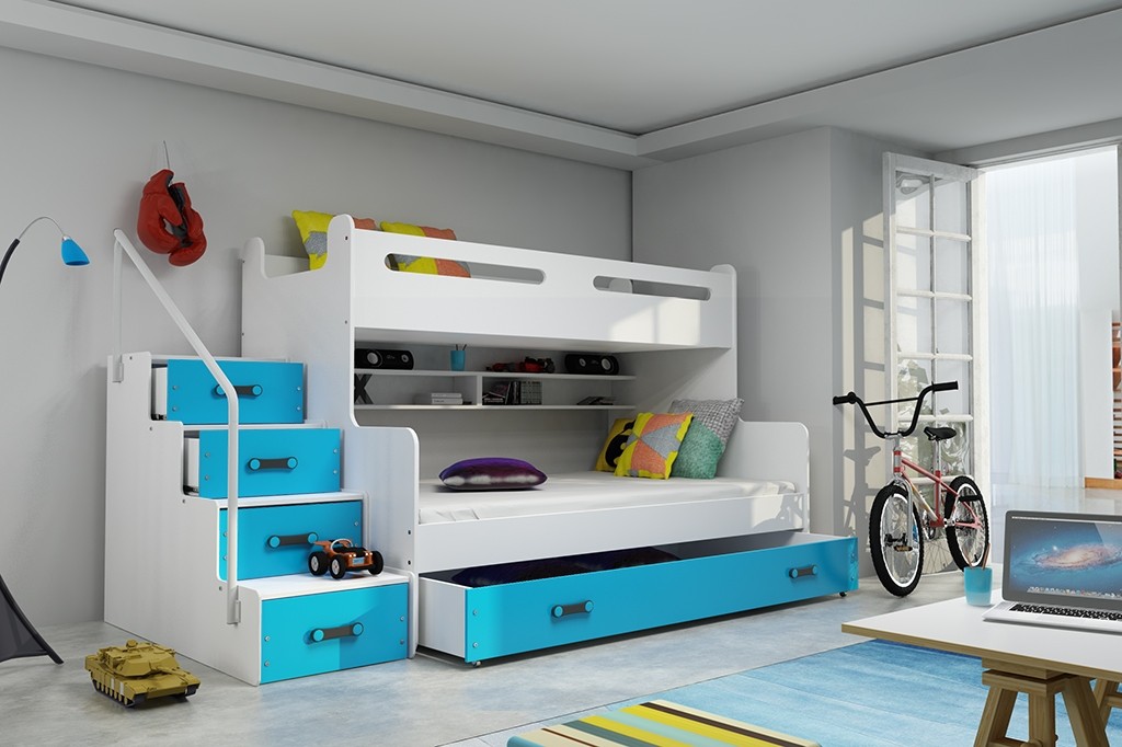 S krevetom na kat MAXIM možete optimalno iskoristiti prostor u dječjoj sobi, jer je izrađen na iznimno funkcionalni način. Umjesto klasičnih ljestvi, kreveti na kat MAXIM opremljeni su super sigurnim i upotrebljivim stepenicama, a stepenice u sebi imaju ugrađene ladice za odlaganje. Boju ladice možete izabrati između 5 različitih boja.