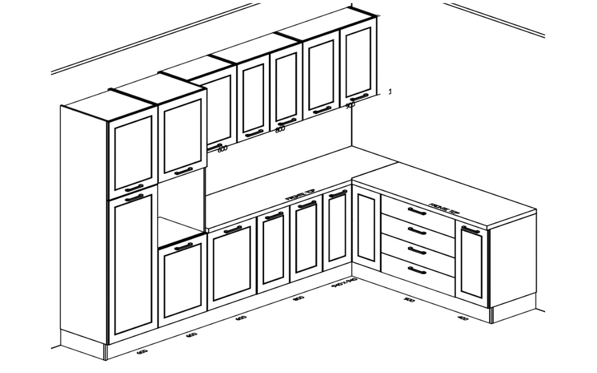 - Donji ormarići: 45 cm s tri ladice, 60 cm za pećnicu, 60 cm fronta za perilicu posuđa, 60 cm s vratima za sudoper