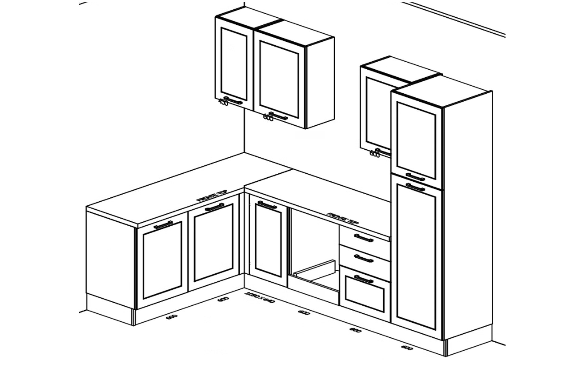 - Donji ormarići: 60 cm s vratima za sudoper, 60 cm fronta za perilicu posuđa, 108 x 64 cm kutni ormar s vratima, 60 cm za pećnicu, 60 cm s tri ladice