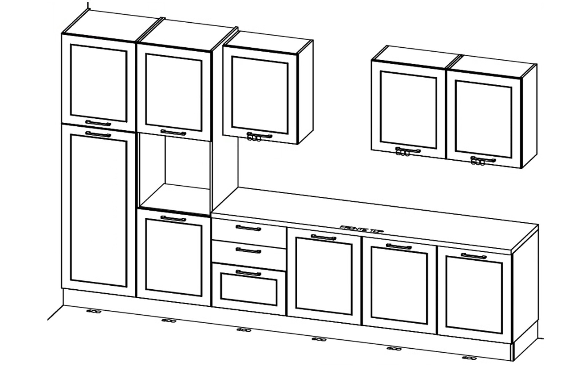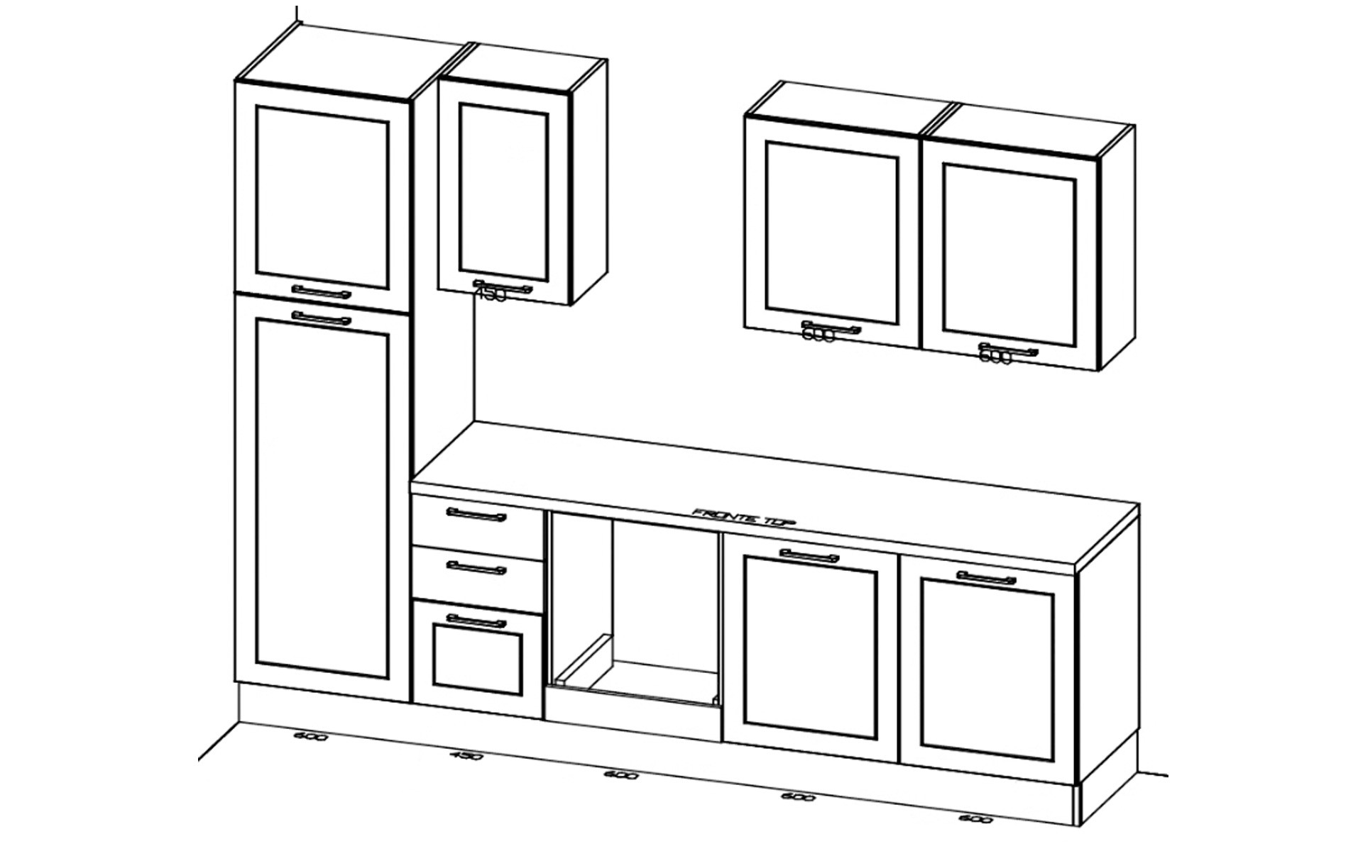 - Donji ormarići: 60 cm s tri ladice, 60 cm s vratima, 60 cm fronta za perilicu posuđa, 60 cm s vratima za sudoper