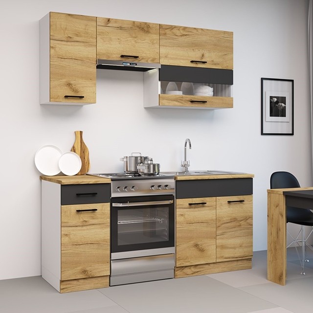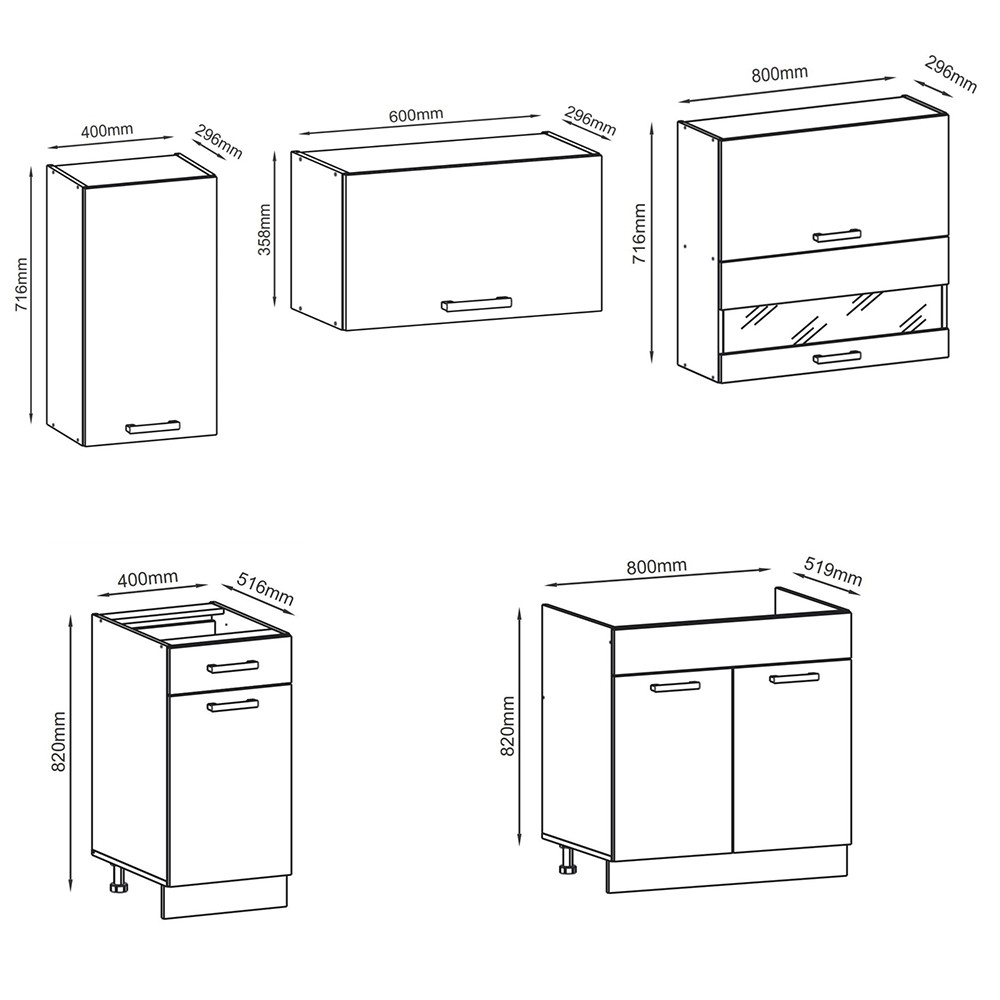 Gornji dio bloka sastoji se od tri ormarića. Prva, širine 40 cm, uključuje dvije unutarnje police i obična vrata, dok se druga, širine 80 cm, može pohvaliti ostakljenim vratima kroz koja se može vidjeti sadržaj. Oba ormarića su visoka 71,6 cm i duboka 29,6 cm. Treći ormarić, širine 60 cm, visine 35,8 cm i dubine 29,6 cm, opremljen je podiznim vratima, idealnim za montažu kuhinjske nape.