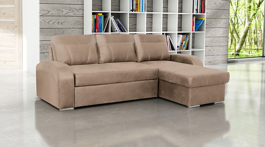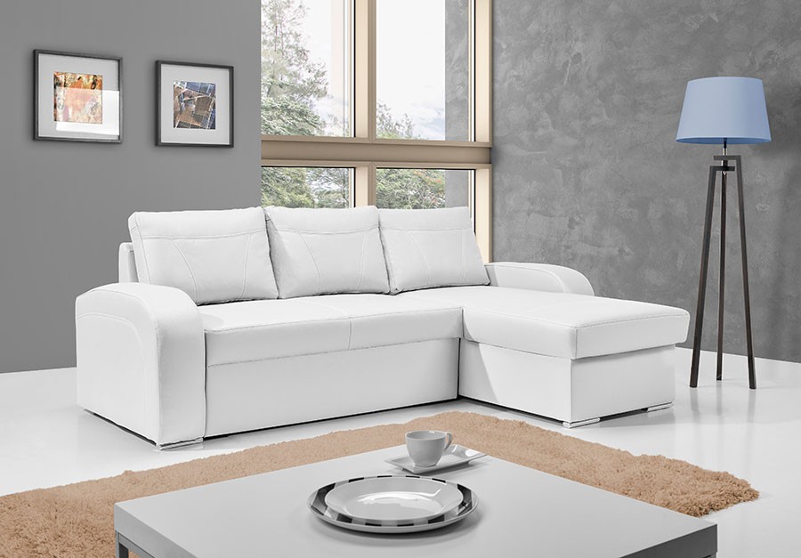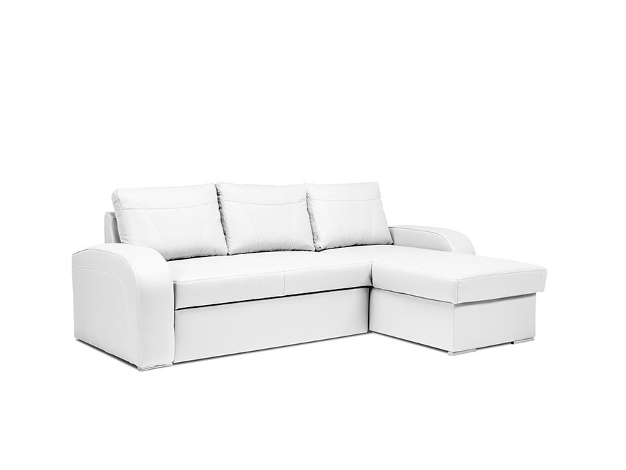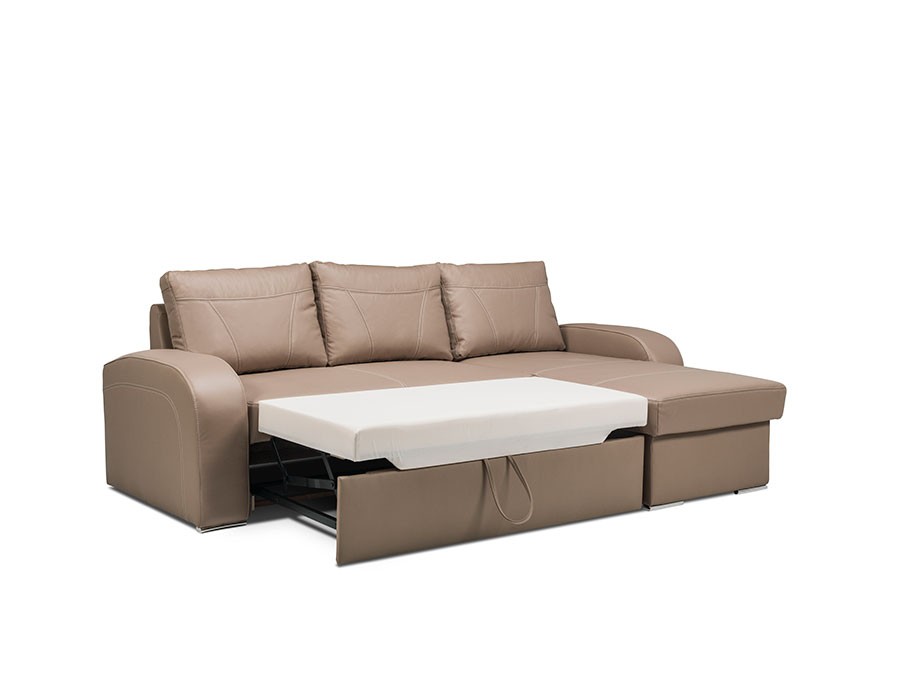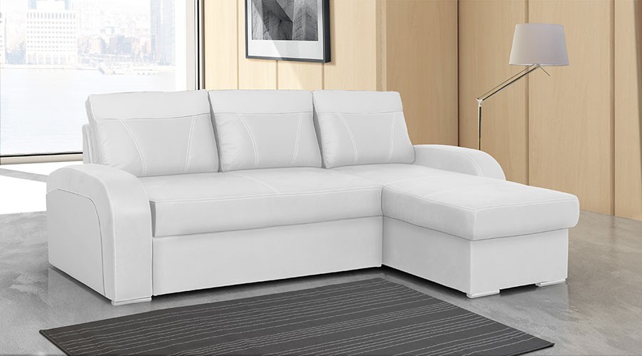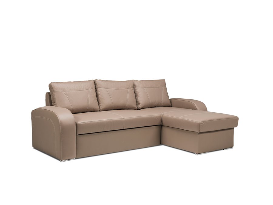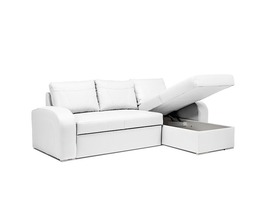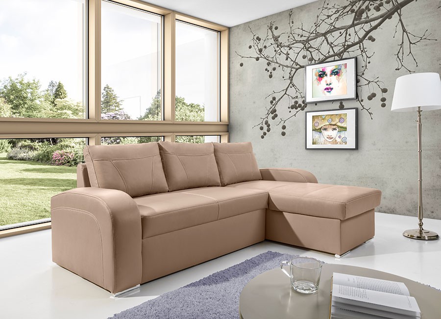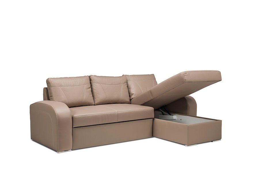 Kutna sjedeća garniture ESILE je kutna kožna sjedeća garnitura s ležištem i sandukom za skladištenje. Prava koža je na sjedećem dijelu, umjetna koža na pozadini. Je univerzalna, tako da ju možete sastaviti v lijevom ili desnom kutu.