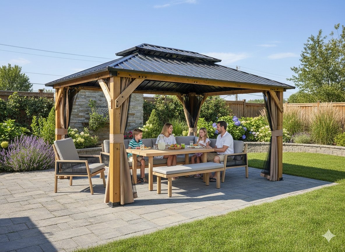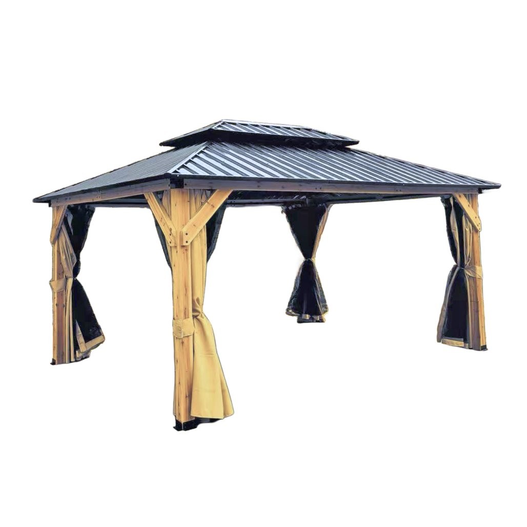 Kombinacija jelovega lesa i jeklene konstrukcije poudari naraven videz i stabilnost. Streha iz jeklene pločevine debeline 0,3 mm pomaga pri zaščiti pred soncem, dežjem i rahlo točo. Stranske stene iz poliestra povečajo zasebnost ter pomažu pri zaščiti pred vetrom i soncem. Pocinkani spojni elementi prispevajo k odpornosti proti koroziji.