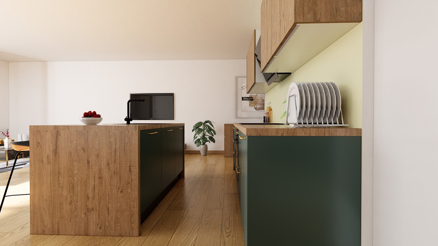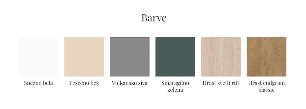 Moderna kuhinja Selene dostupna je u čak šest različitih modernih mat boja koje će modernizirati vaš dom. Ako više volite svjetlije boje, možete se odlučiti za snježno bijelu ili pješčano bež boju, za nešto topliji izgled kuhinje dostupni su drveni dekori svijetli hrast rift i nešto tamniji hrast endgrain classic, a za ljubitelje tamnijeg izgleda kuhinje dostupne su i vulkansko siva i šarmantna smaragdno zelena boja. Različiti dizajni pultova i ručki daju točku na i kuhinji.