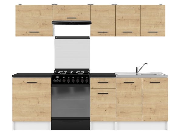 Kuhinja Sara 240 cm sadrži drveni dio sa pultom 40 cm i ne uključuje kuhinjske aparate (napa, pećnica, ploča za kuhanje), sudoper i slavinu.
