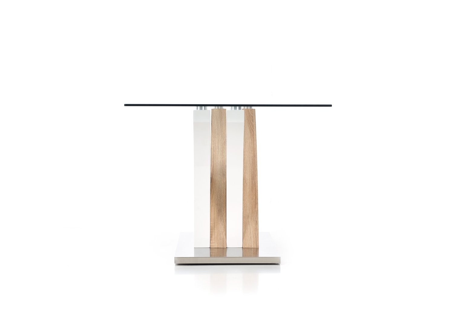 Stol Anron duljine 160 cm, s površinom od stakla, lakiranog i laminiranog MDF-a. Savršen izbor za moderne prostore s kombinacijom sonoma hrasta i bijele boje.