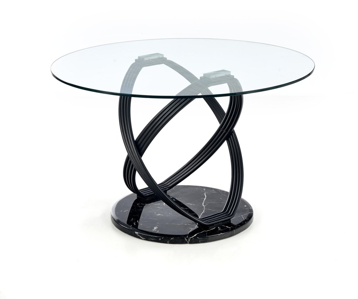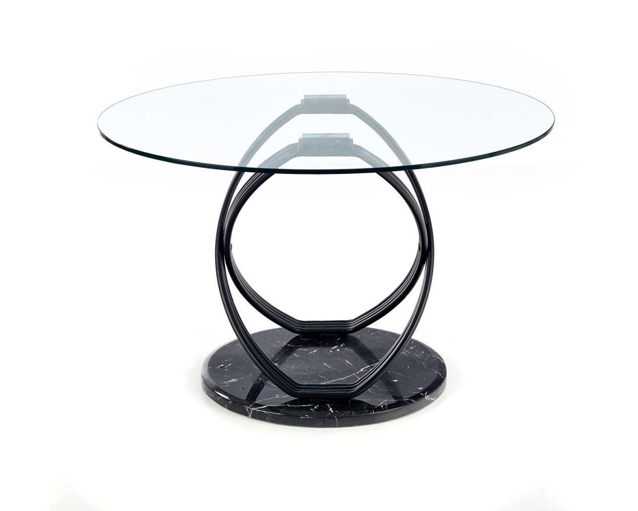 Stol Darl promjera 122 cm, izrađen od kombinacije stakla, praškasto lakiranog čelika i umjetnog kamena. Prozirna staklena površina pruža sofisticiran i moderan izgled, savršeno odgovara elegantnim interijerima.