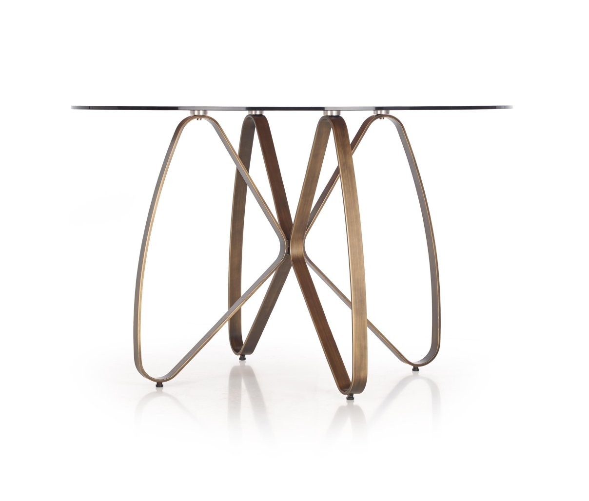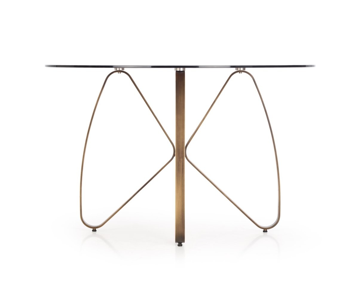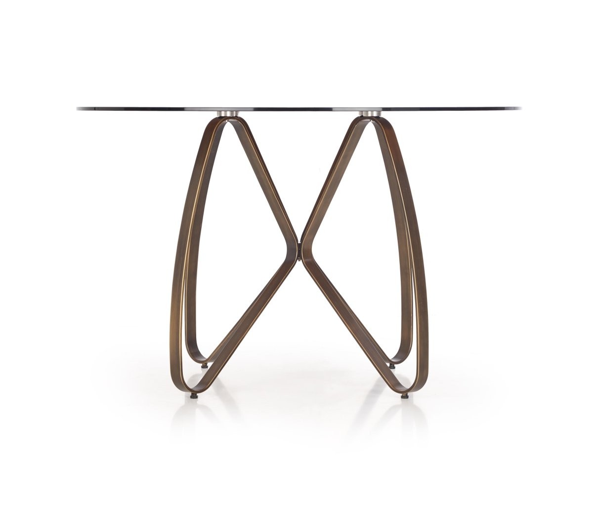 Stol Esro s okruglom staklenom pločom u smeđoj boji i nogama u antik zlatnoj boji. Elegantan i moderan stol za šest osoba.