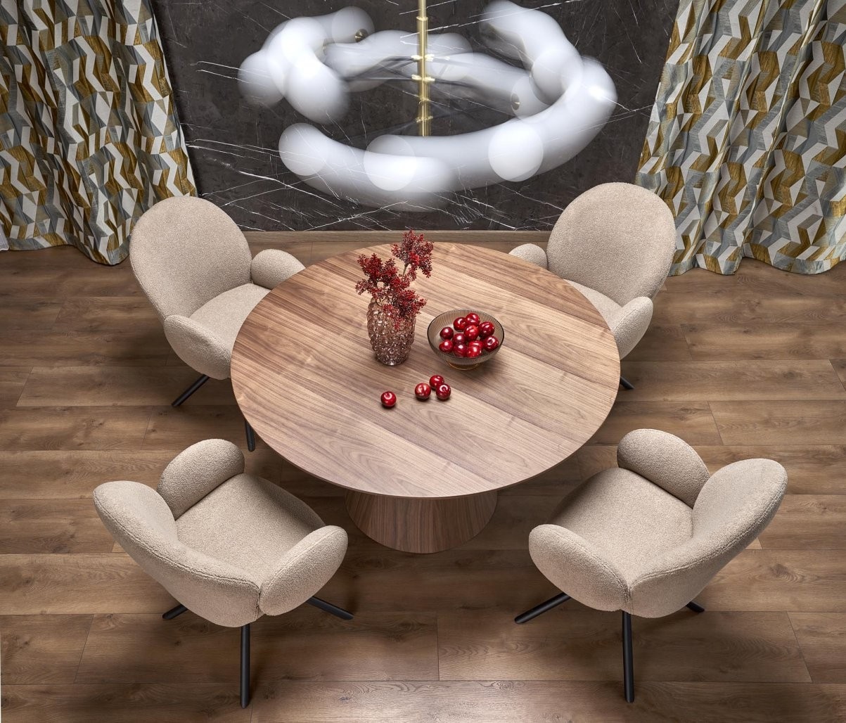Stol Galar s okruglom pločom od prirodnog oraha za 5 osoba. Elegantan i čvrst dizajn prikladan za suvremene stambene prostore.