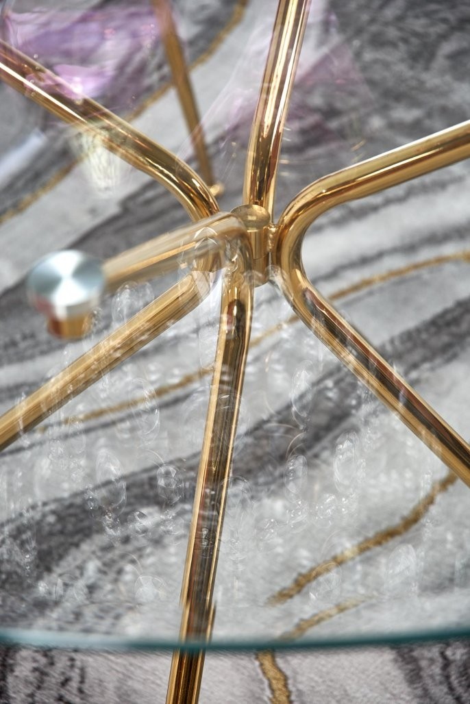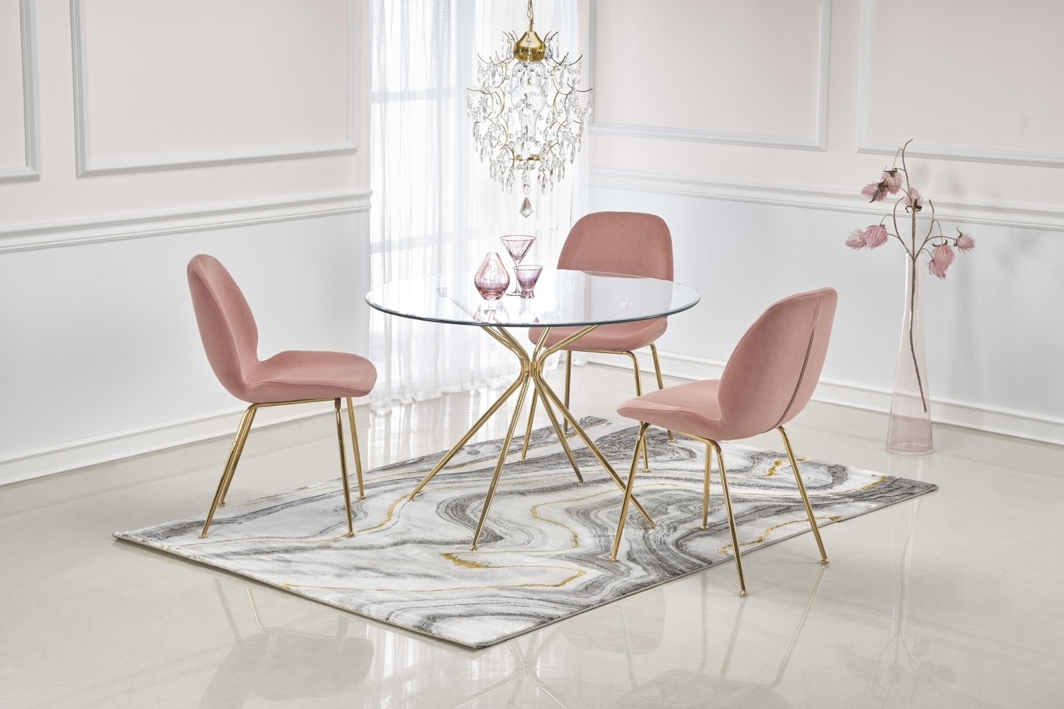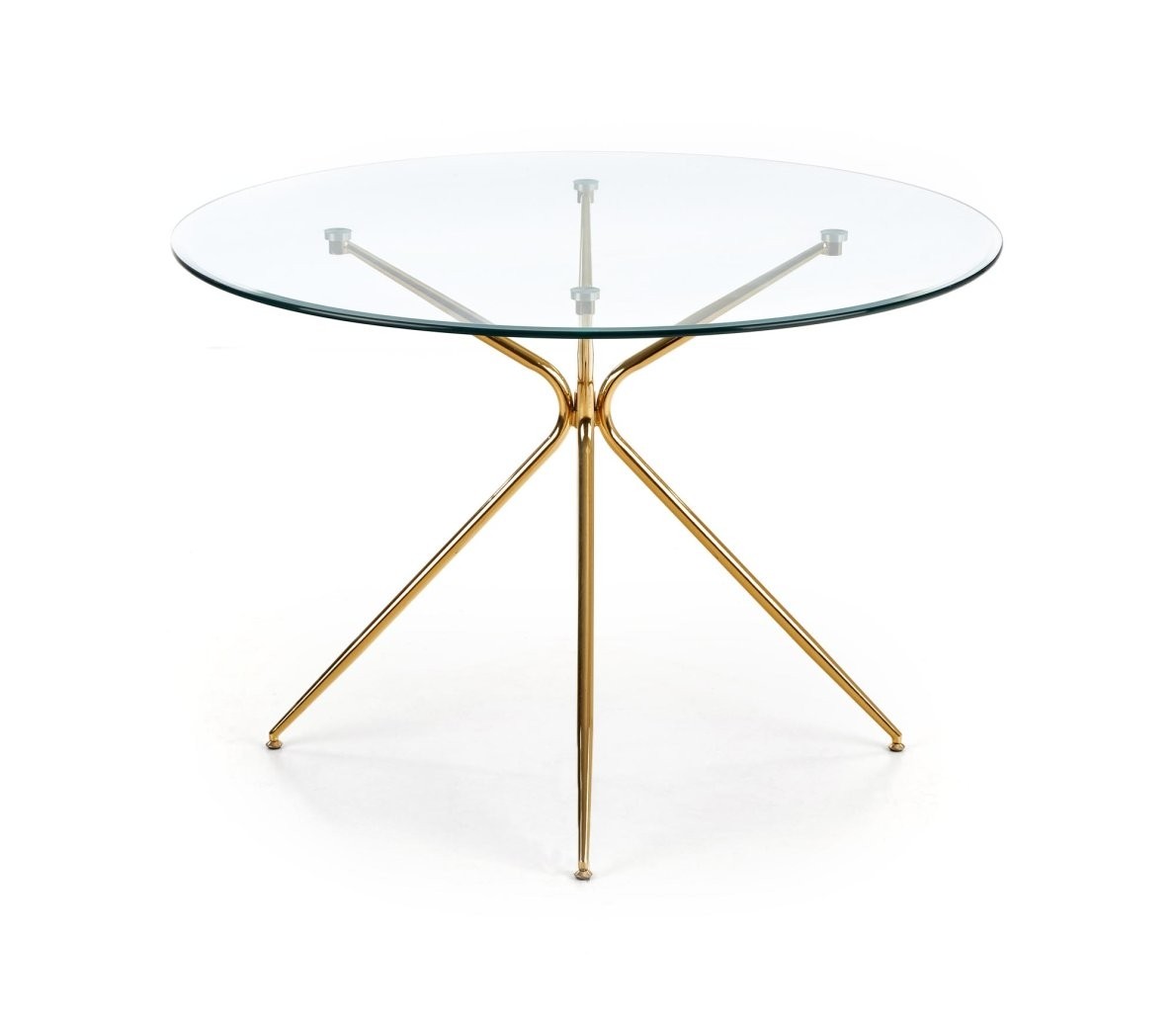 Stol Inran s okruglom staklenom površinom i zlatnim kromiranim nogama. Elegantna kombinacija prozirnog stakla i zlata donosi dašak prestiža u svaki prostor. Prikladan za četiri osobe.
