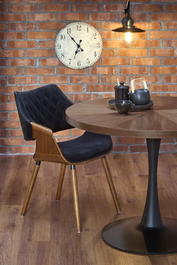 Stol Kelvar s crnim metalnim okvirom i MDF pločom s prirodnim furnirom u orahu donosi dašak elegancije u svaki prostor. Promjer 100 cm, prikladan za četiri osobe.