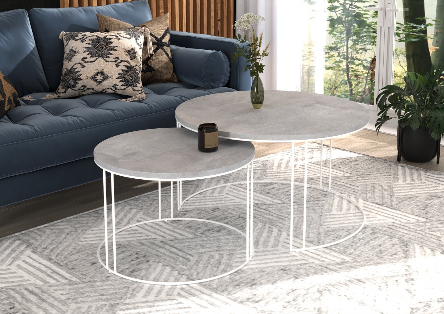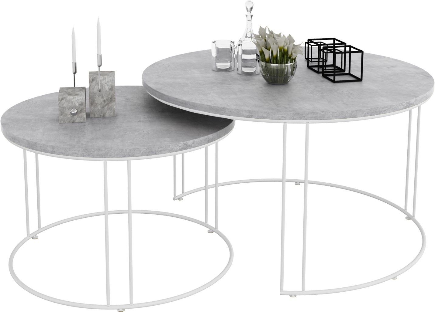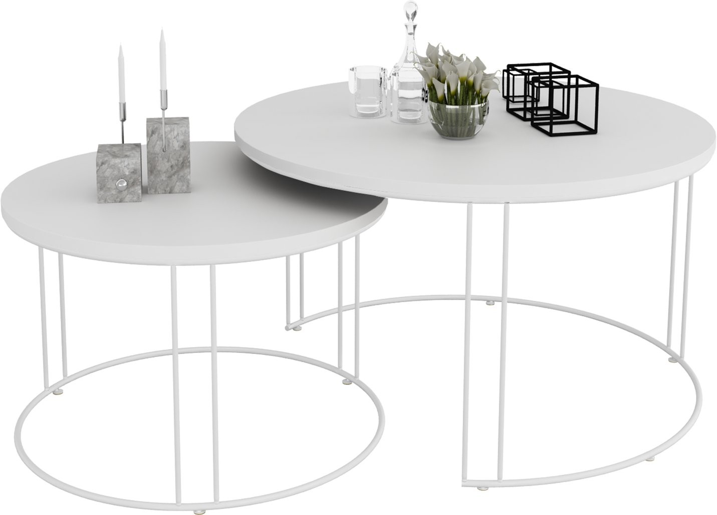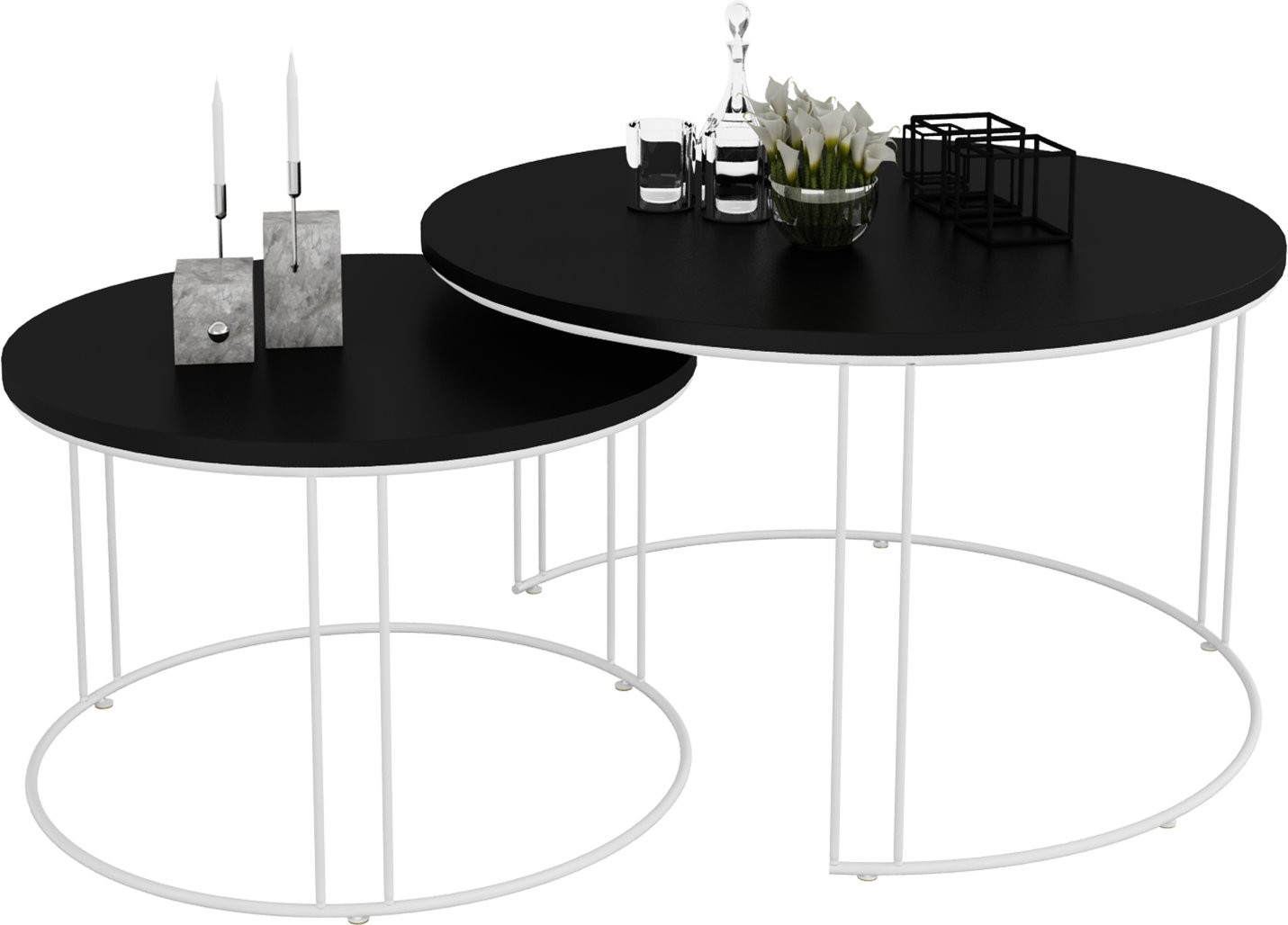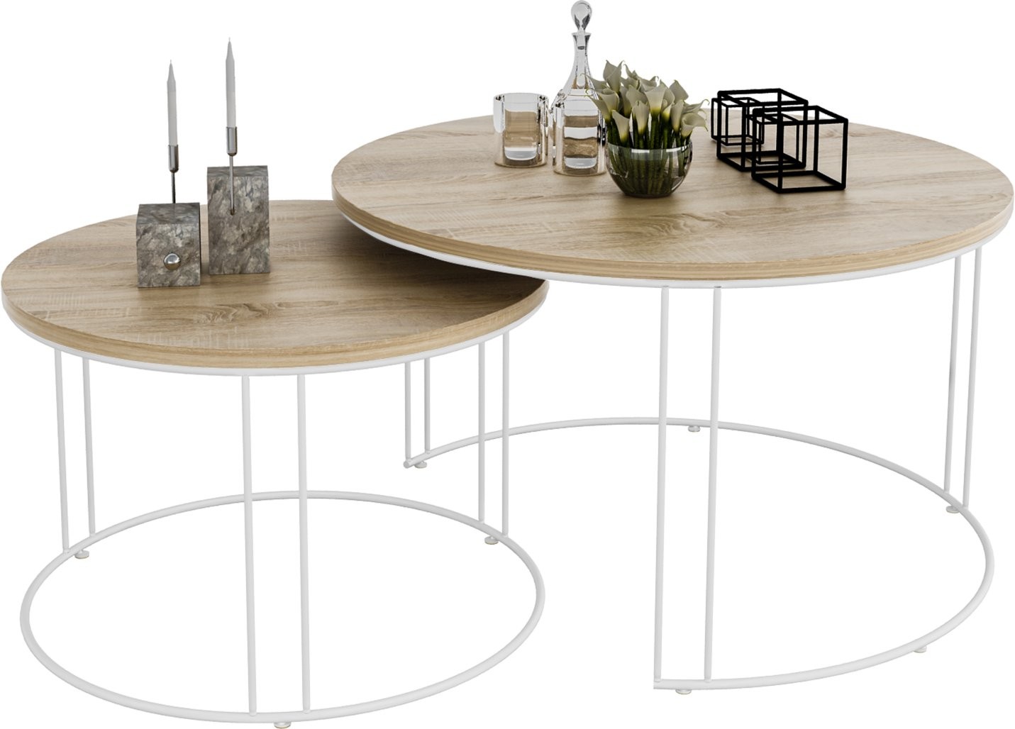 Set uključuje dva stolića različitih dimenzija koje možete slobodno kombinirati ili koristiti odvojeno. Njihova svestranost omogućuje korištenje kao klupski stolići, pomoćni stolići uz sofu ili čak kao dekorativni element u prostoru.